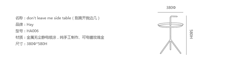 Don't Leave Me Side Table(别离开我边几)出自丹麦设计师Thomas Bentzen之手,Don't Leave Me Side Table(别离开我边几)以粉体涂装钢材制成,不仅有着可爱俏皮的外型,顶端的弯曲部份可以轻松的提起它,是一张非常实用的活动边几,同时也可以户外使用。