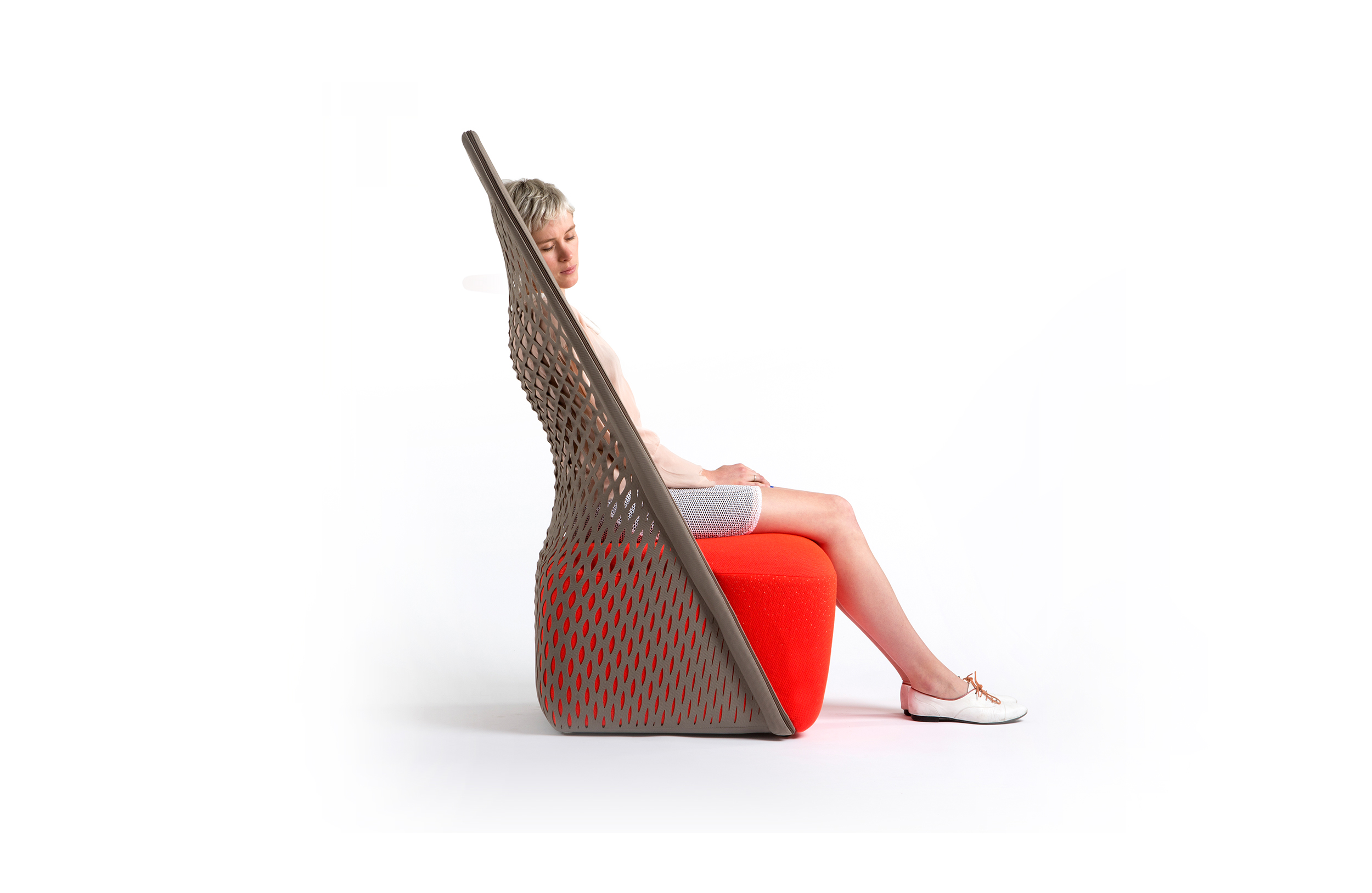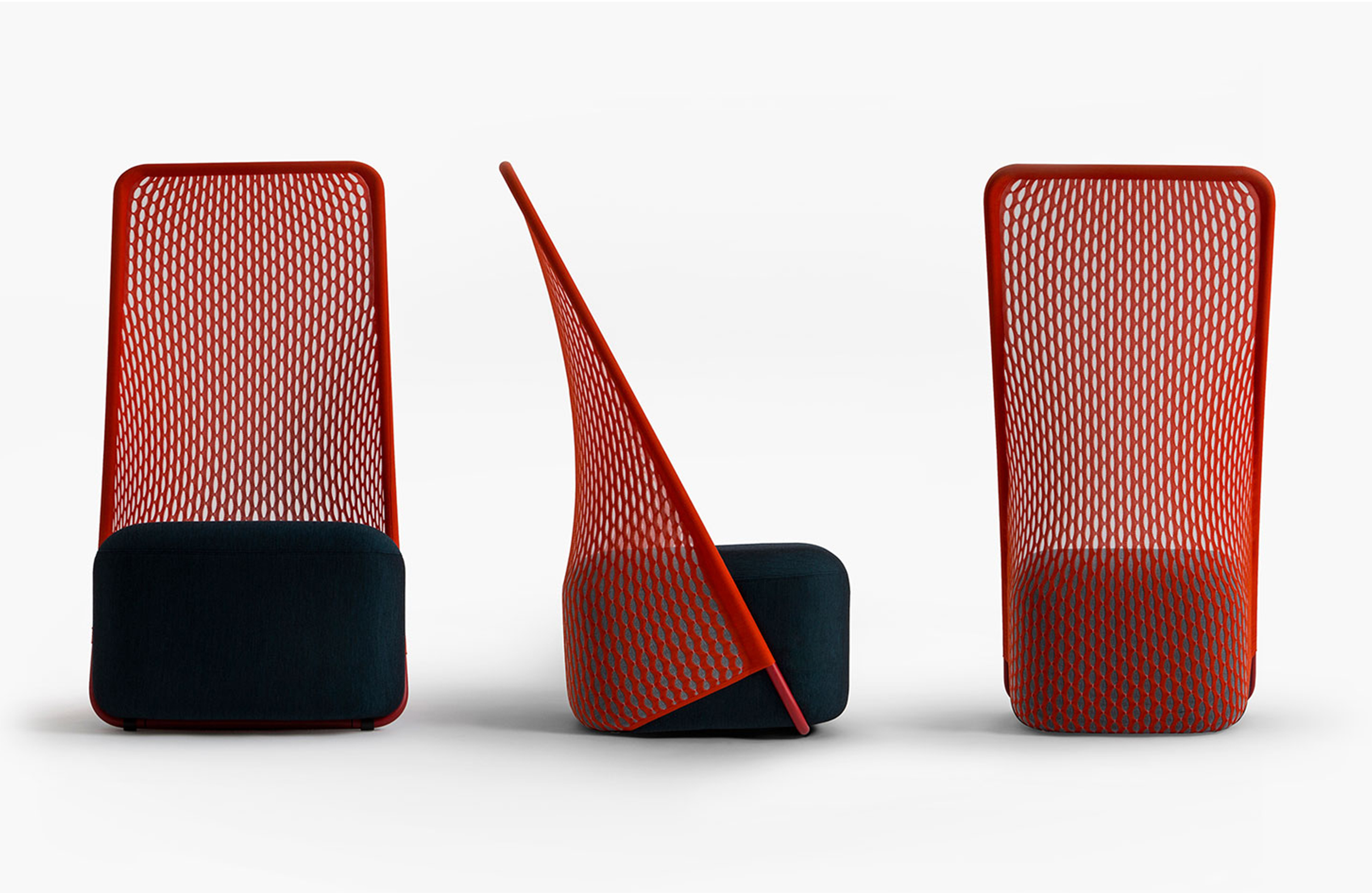 “摇篮”是两种类型座位的独特组合;一个网状结构吊床和一个传统的软垫沙发椅。扶手椅源于工作室的材料驱动、工艺主导、工业设计方法、网格材料的构建研究,以及传统座椅组件之间的关系研究。“摇床”采用了一种定制的剪裁模式,允许非弹性织物以三维的方式进行。这允许正确的张力,舒适地支持身体和视觉上和身体上减少产品的重量。