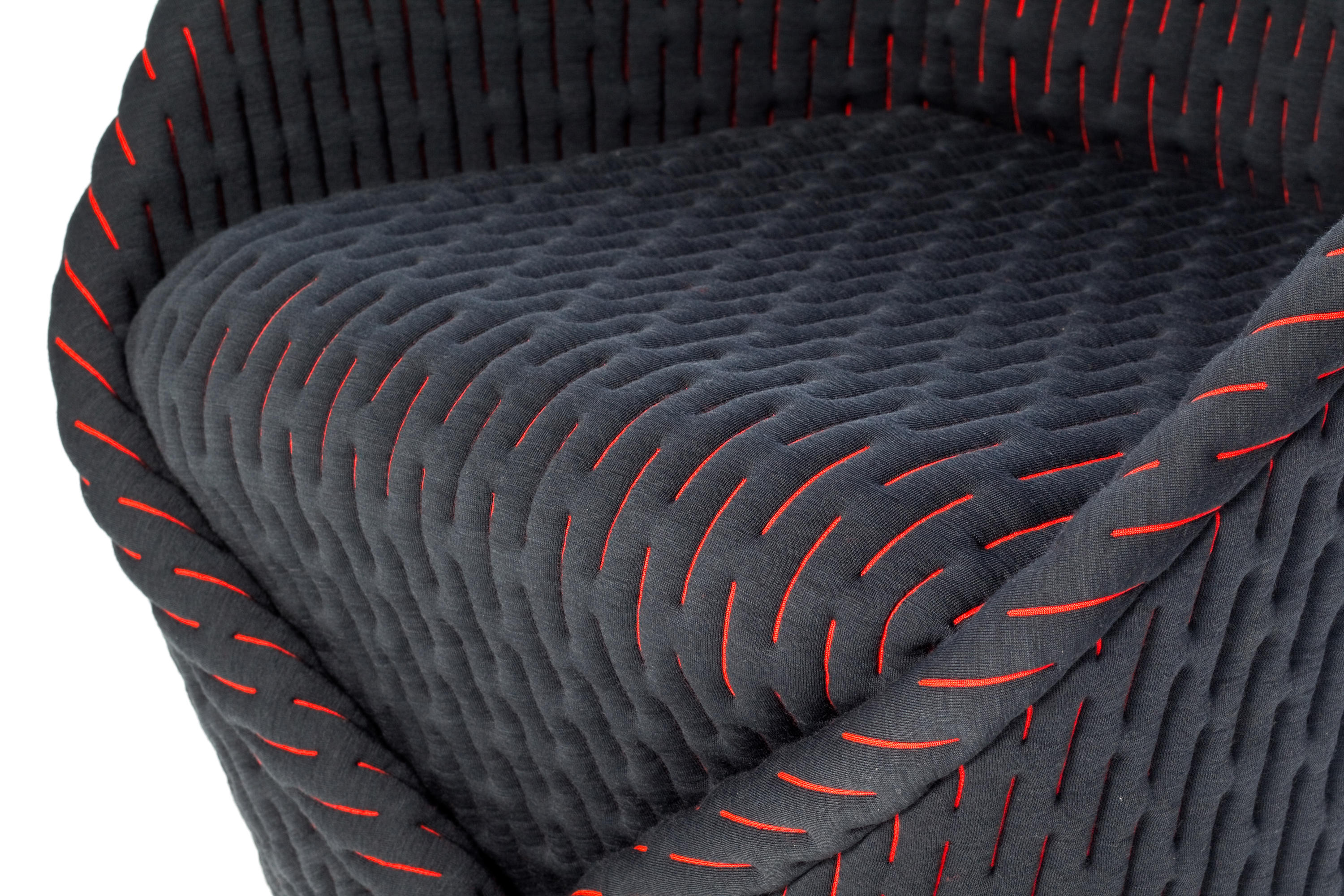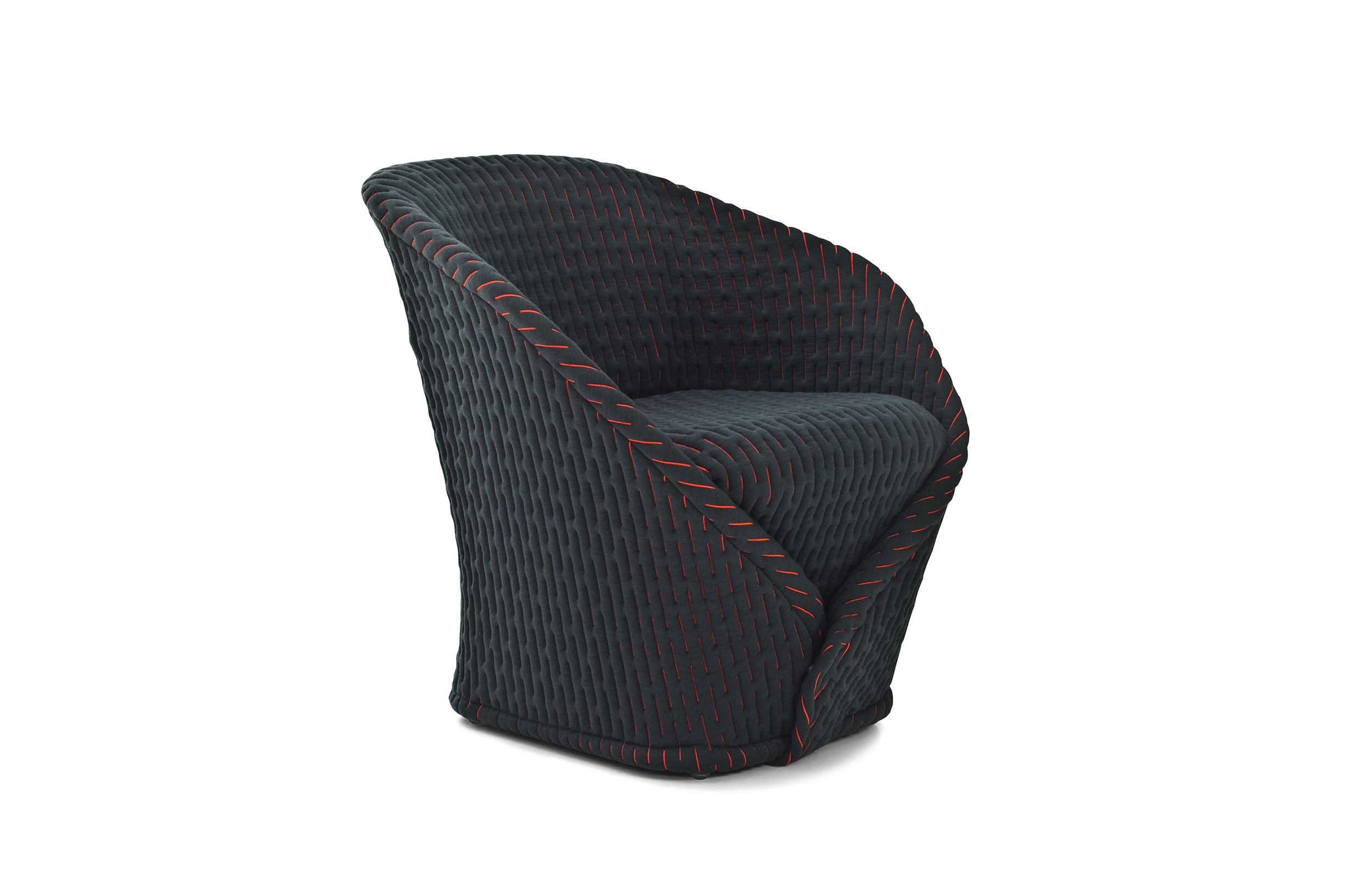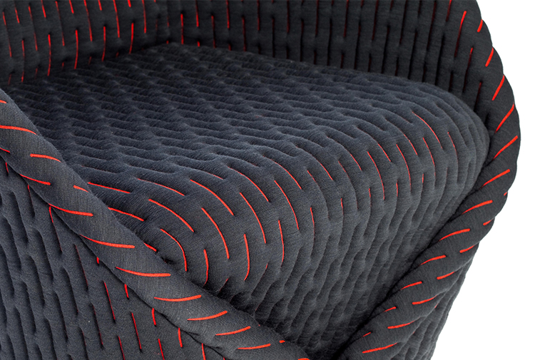 伪装成休闲椅的扶手椅,用他们的外表来控制空间。这主意很简单,用一件有衬垫的大衣盖住金属框架然后把它变成别的东西。一种非常直立的姿势,扶手的形状让人联想到双排扣外套的翻领,而这种相似之处就在中央扣扣上。室内装潢变成了衣服,可以在不过度的情况下,将赤裸的身体转变成一种追求自身内在同一性的物体。