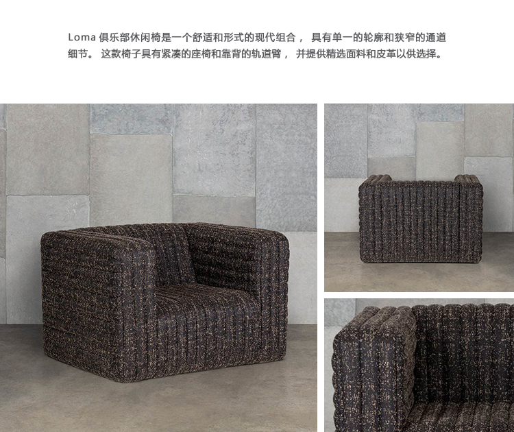 Loma Club Chair(洛马俱乐部休闲椅)是一个舒适和形式的现代组合,具有单一的轮廓和狭窄的通道细节。 这款椅子具有紧凑的座椅和靠背的轨道臂,并提供精选面料和皮革以供选择。