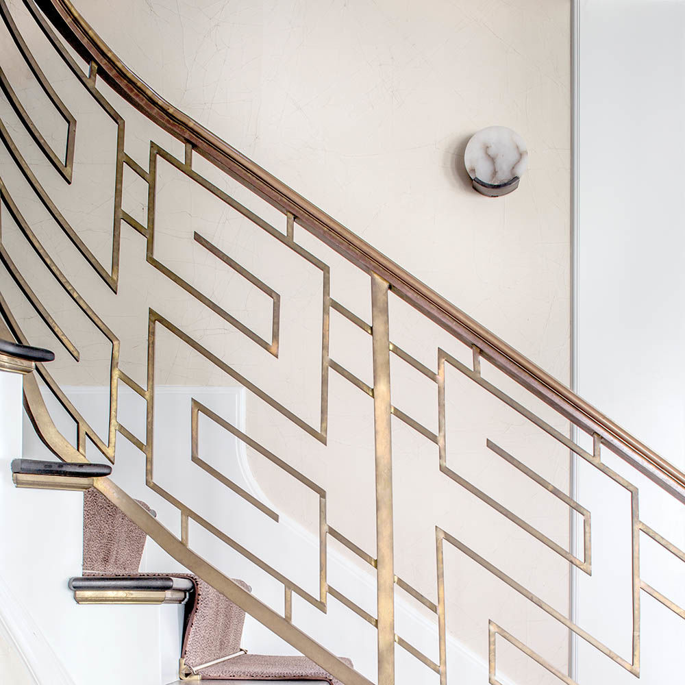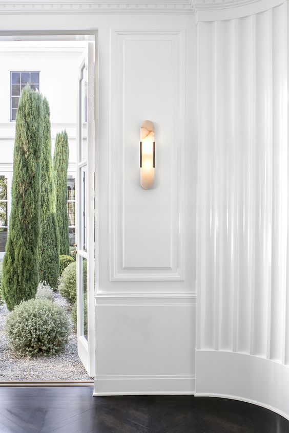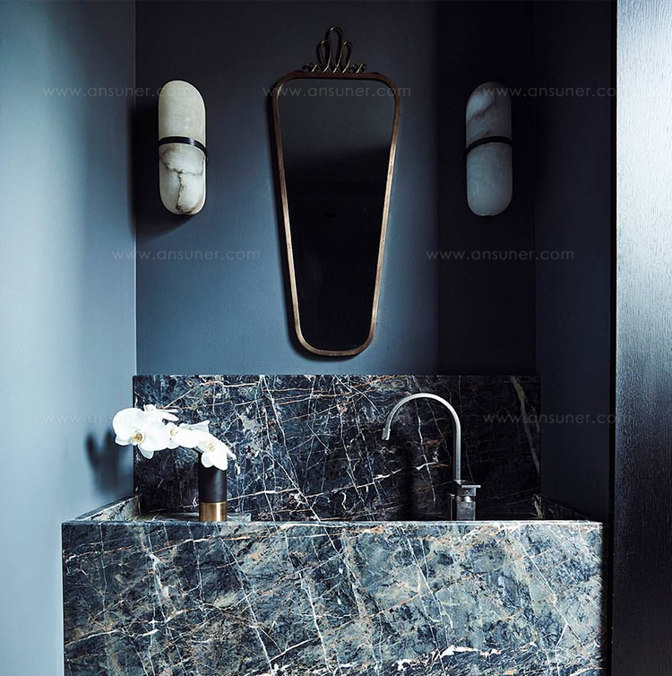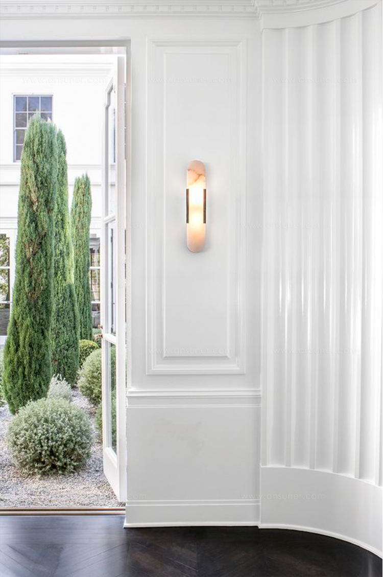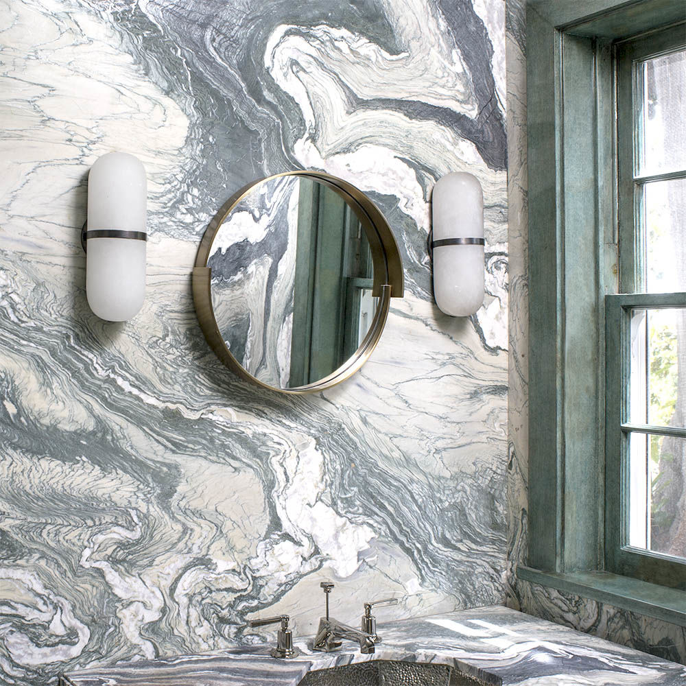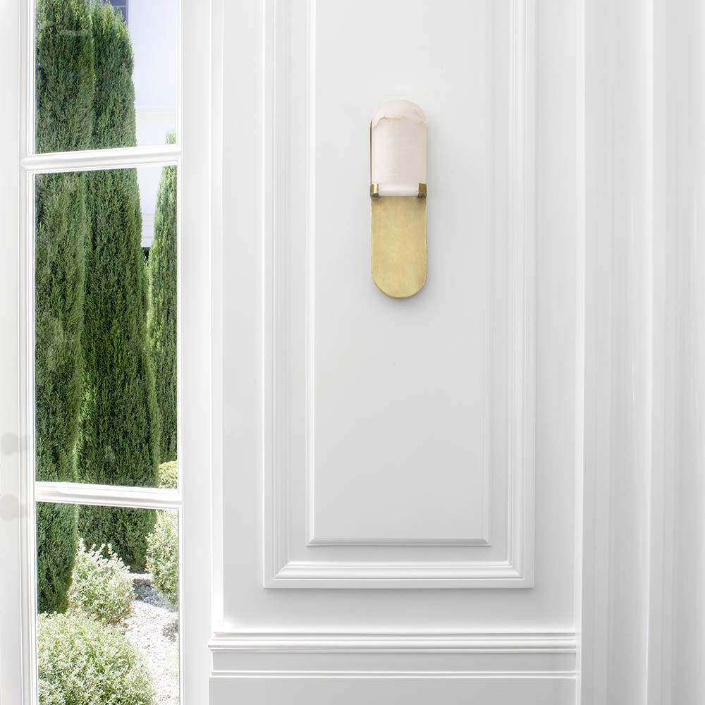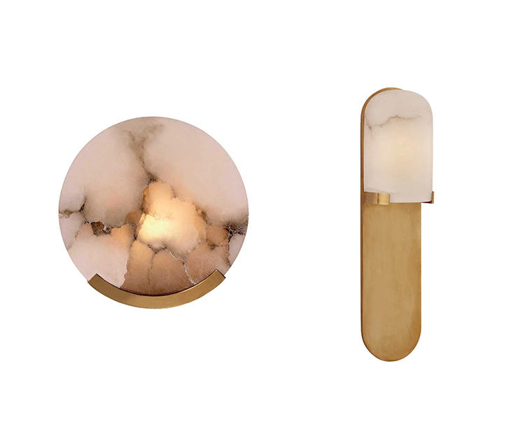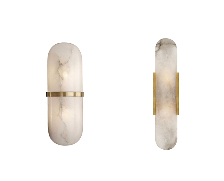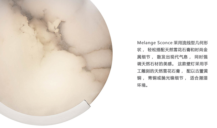 Melange壁灯采用流线型几何形状,轻松搭配天然雪花石膏和时尚金属细节,散发出现代气息,同时强调天然石材的美感。 这款壁灯采用手工雕刻的天然雪花石膏,配以古董黄铜,青铜或抛光镍细节,适合潮湿环境。