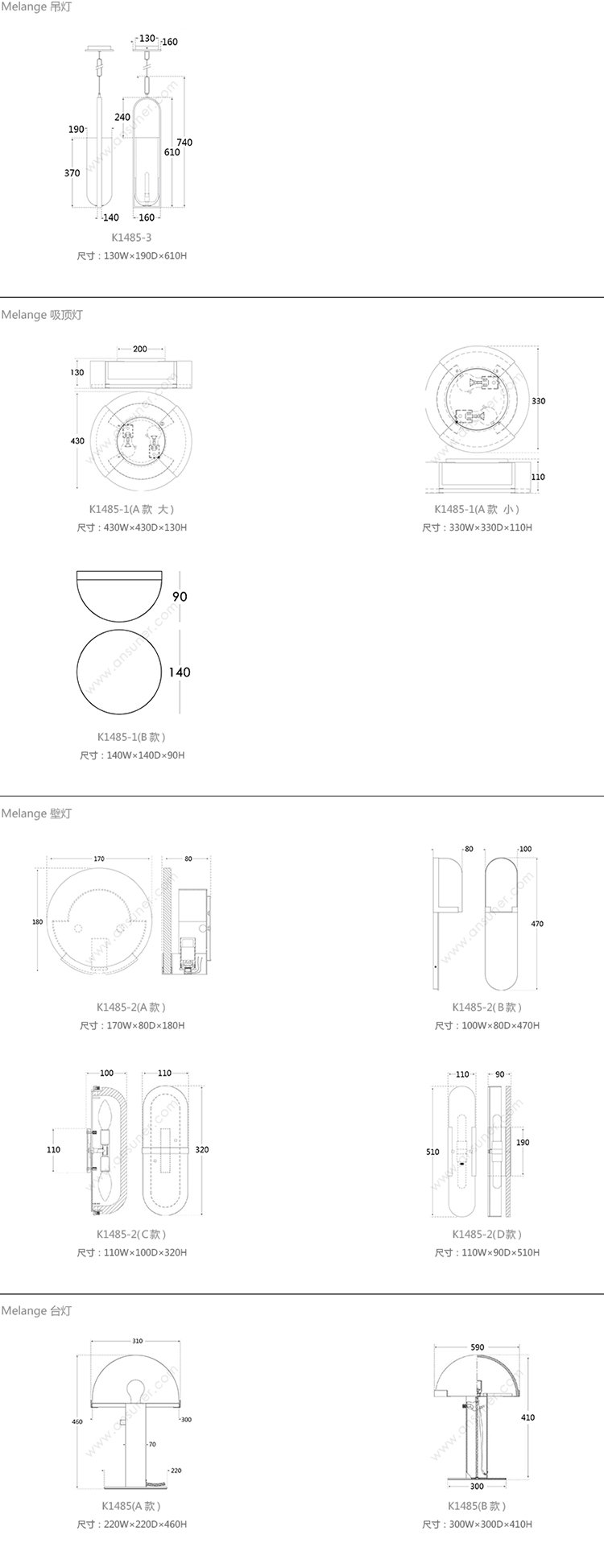 Melange 吊灯 系列尺寸/示意图