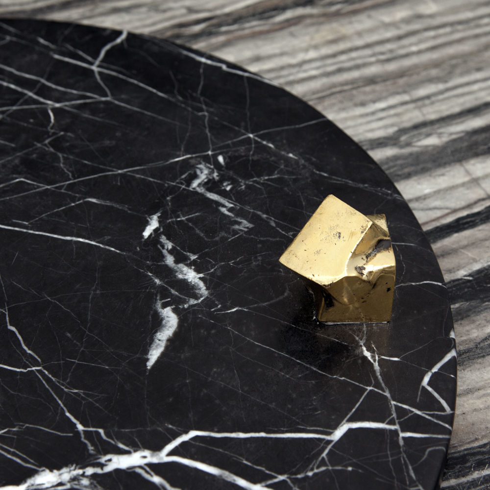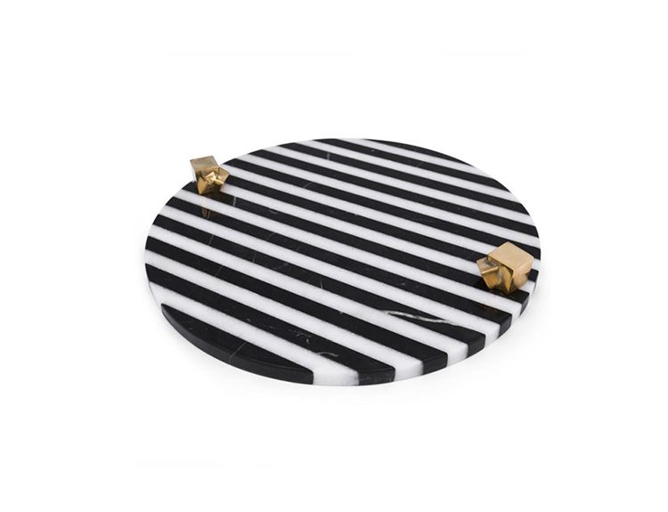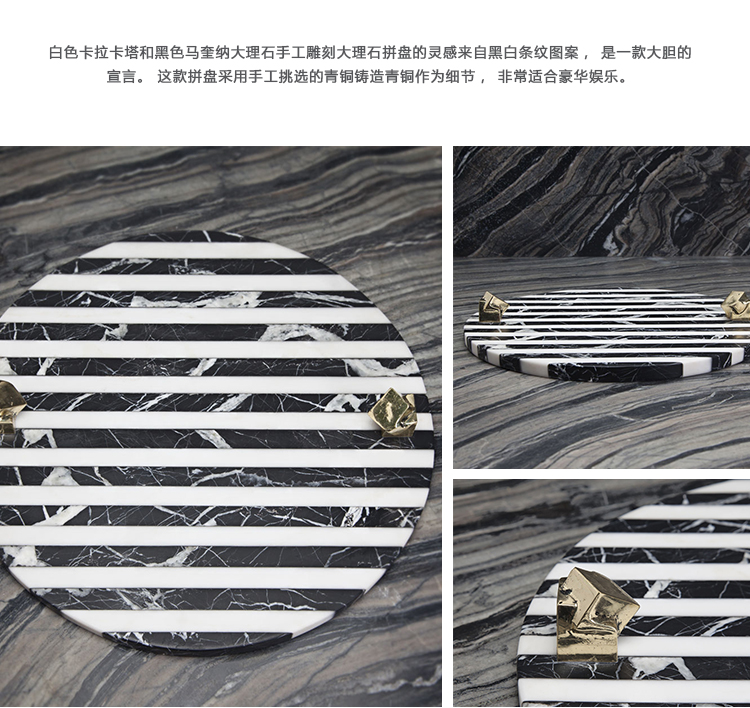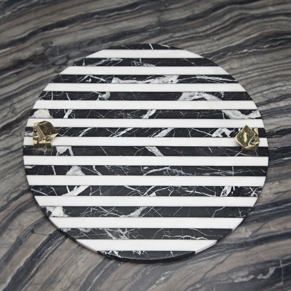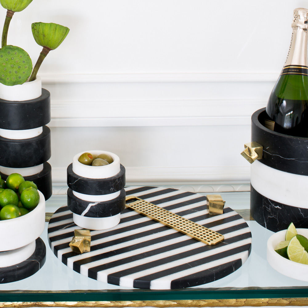白色卡拉卡塔和黑色马奎纳大理石手工雕刻大理石拼盘的灵感来自黑白条纹图案,是一款大胆的宣言。 这款拼盘采用手工挑选的铸造青铜作为细节,非常适合豪华娱乐。