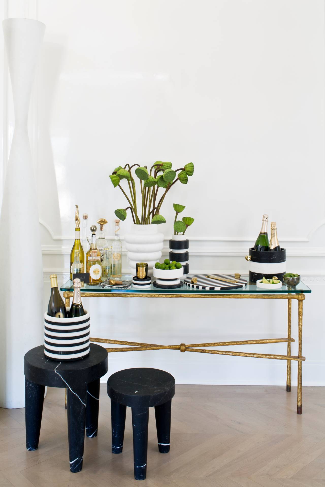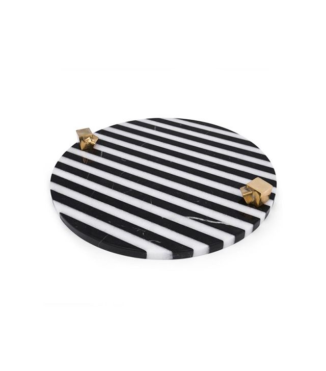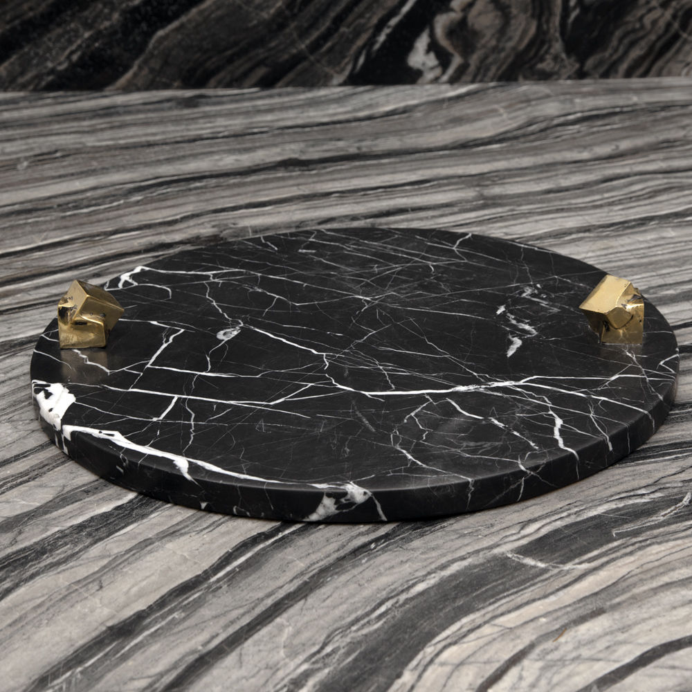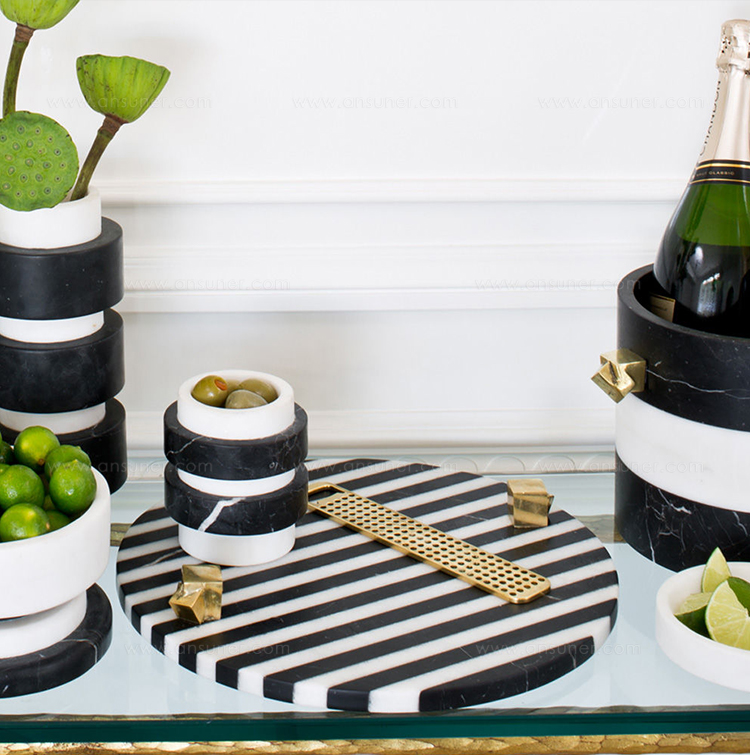 白色卡拉卡塔和黑色马奎纳大理石手工雕刻大理石拼盘的灵感来自黑白条纹图案,是一款大胆的宣言。 这款拼盘采用手工挑选的铸造青铜作为细节,非常适合豪华娱乐。