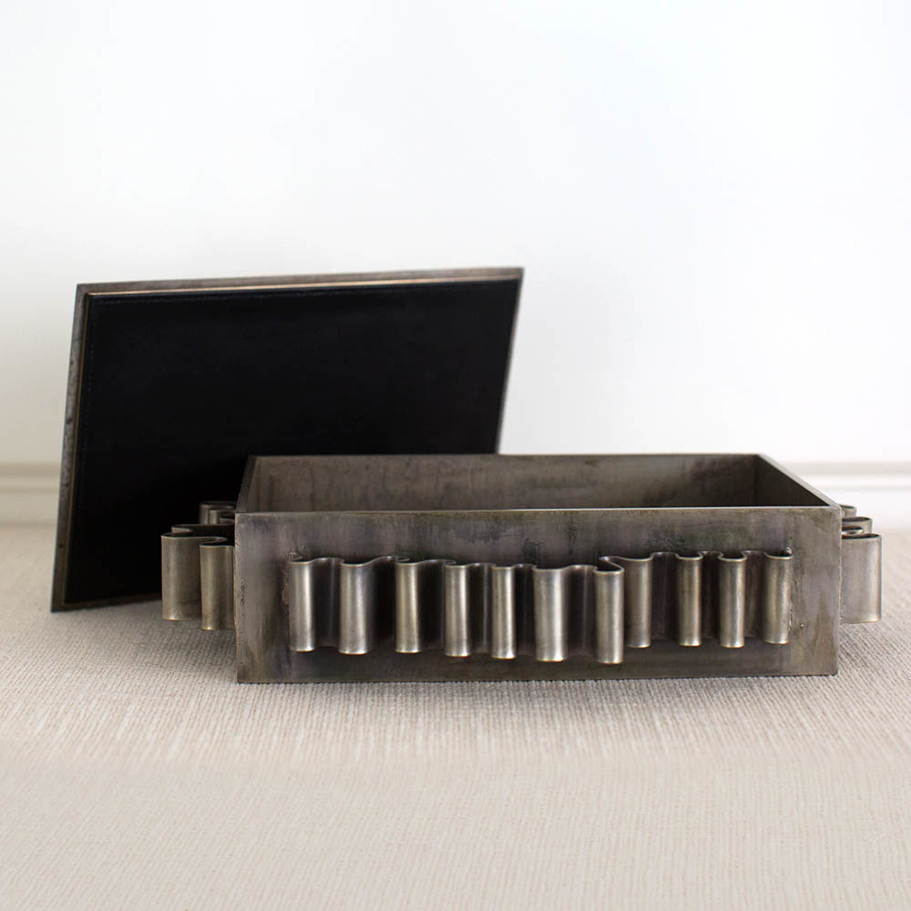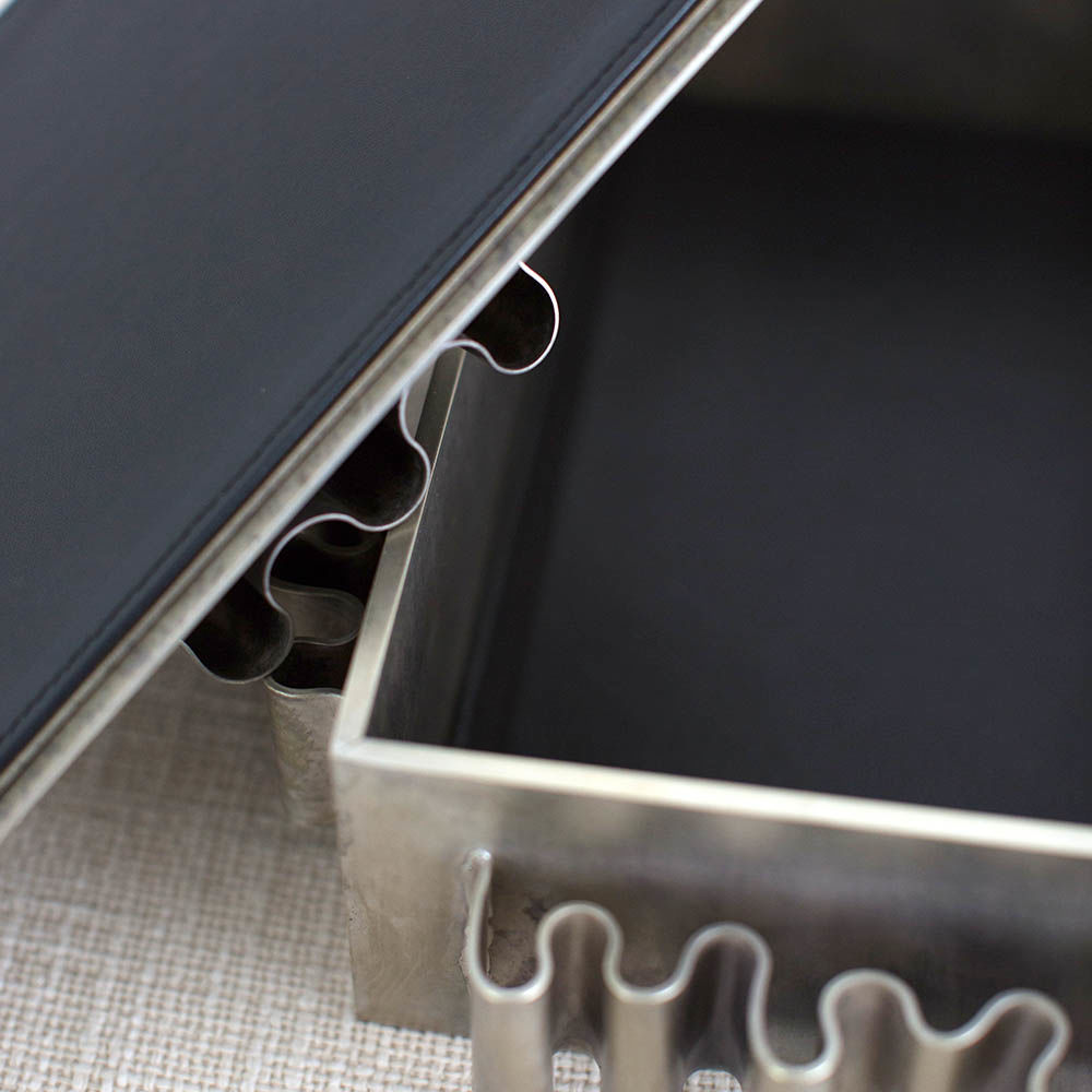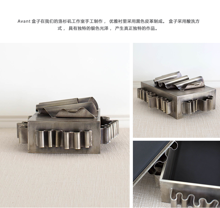 Avant盒子在我们的洛杉矶工作室手工制作,优雅衬里采用黑色皮革制成。 盒子采用酸洗方式,具有独特的银色光泽,产生真正独特的作品。