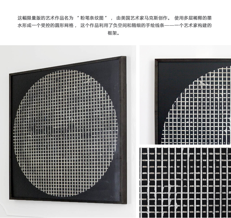 这幅限量版的艺术作品名为“粉笔条纹图”,由美国艺术家马克斯创作。使用多层稀释的墨水形成一个受控的圆形网格,这个作品利用了负空间和精细的手绘线条——一个艺术家构建的框架。