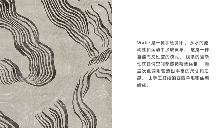 Wake是一种手绘设计,从水的流动性和运动中汲取灵感。 这是一种自信而又过渡的模式。 线条的复杂性在任何空间都感觉精致优雅,而层次色调则营造出丰富的尺寸和质感。 由西藏羊毛和丝绸组成。