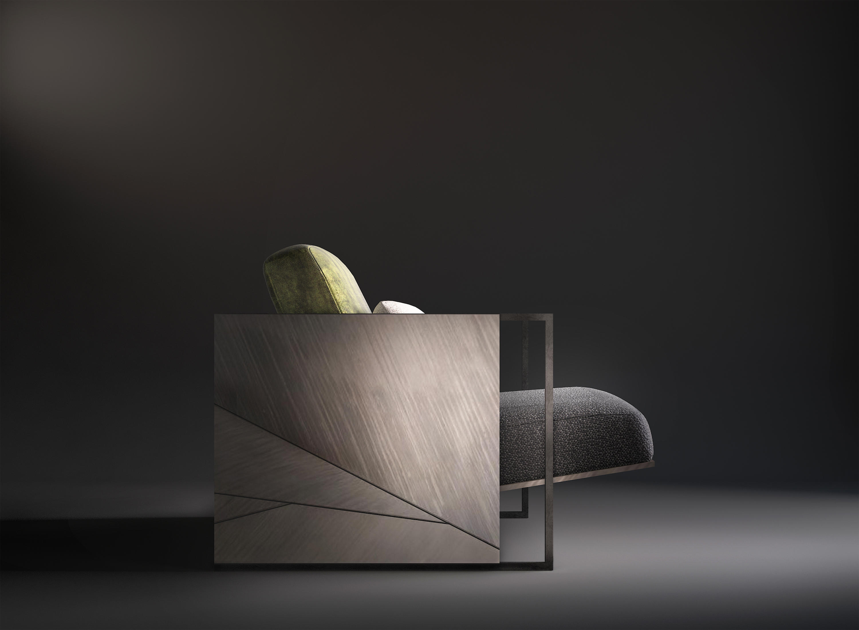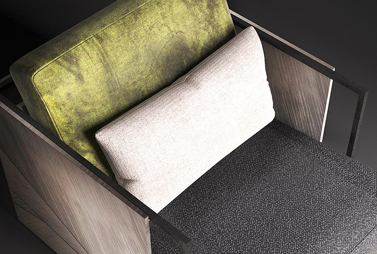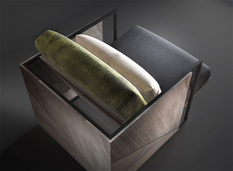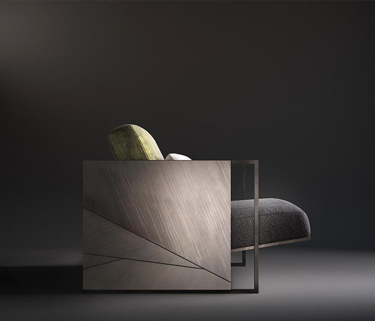 柔和的木质框架和这款杰出扶手椅的古铜色钢饰边完美地结合了舒适和保护,而座椅的倾斜度提供了极佳的靠背支撑。座椅和两个作为靠背的坐垫采用优质面料或优质皮革,配以绿色、白色和深灰色。