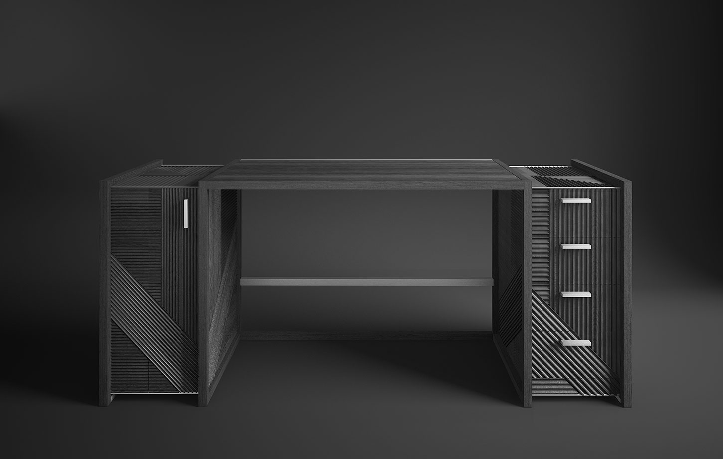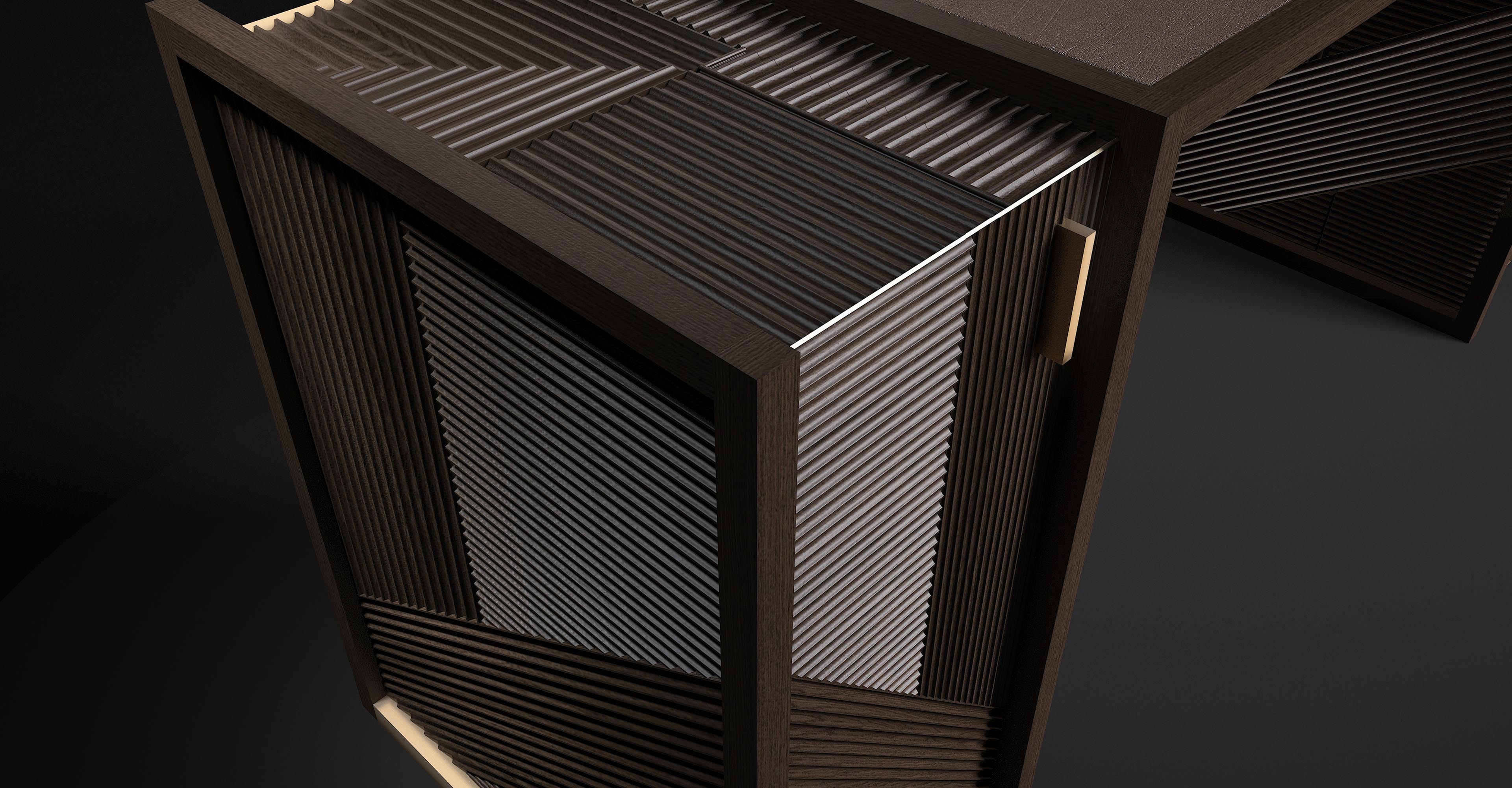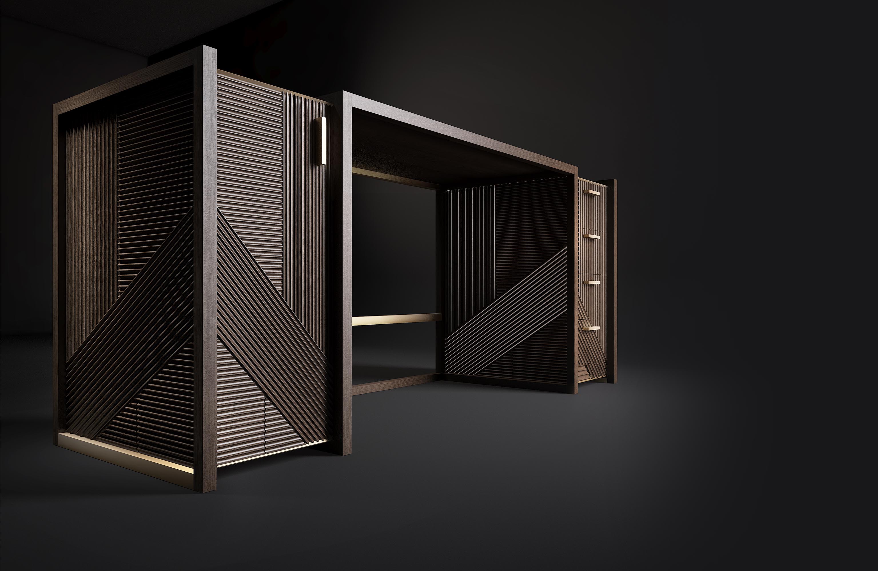凭借其功能性设计,这款灵活的复古风格橱柜营造出简约的几何形状,并在完整空间和空间之间实现完美平衡 典型的表面处理采用交织的橡木编织,手工打磨和涂漆,具有极佳的视觉冲击力。