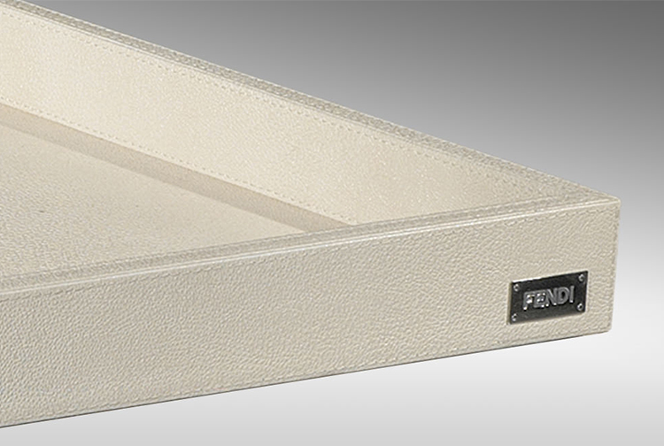 Wooden top and tray polished lacquered, covered in leather, veneered with