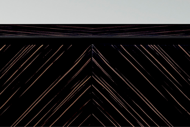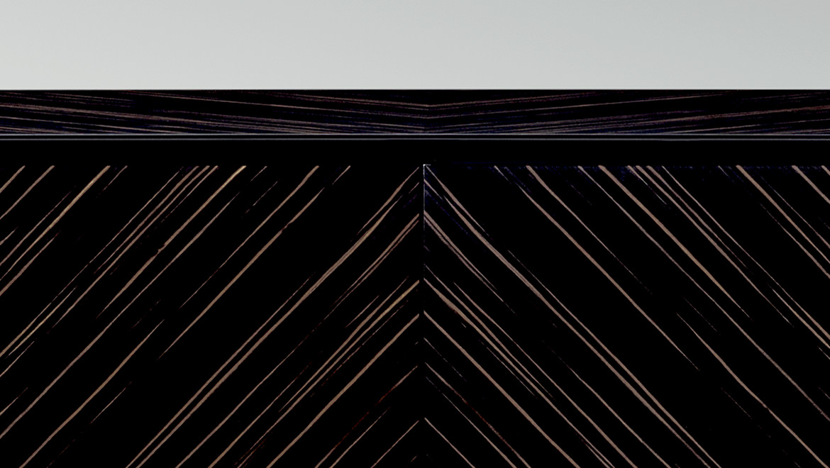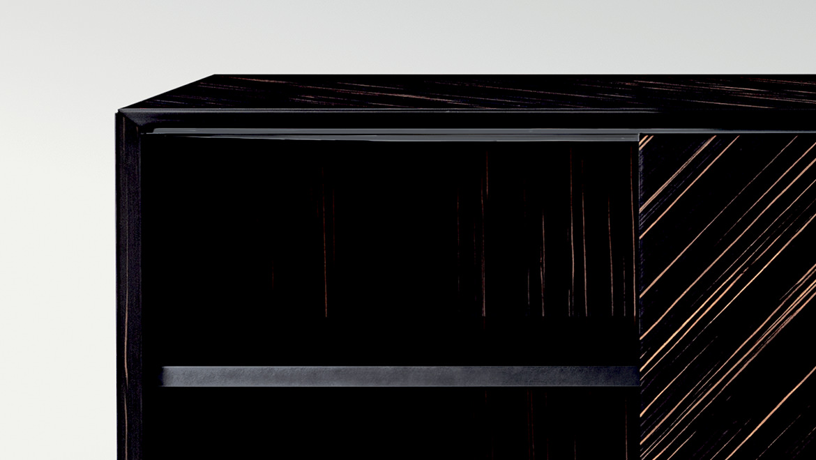SHUTTERS Coplanar opening system, wood covered in Vermont leather or veneered Ebony Macassar with matt finishing