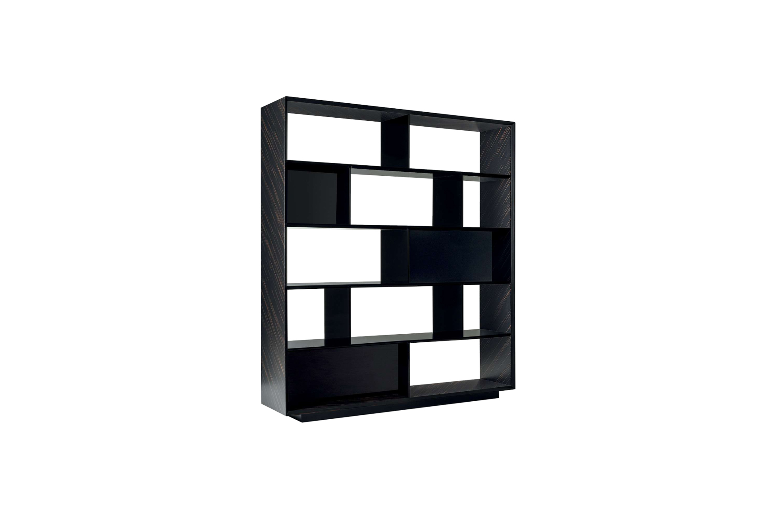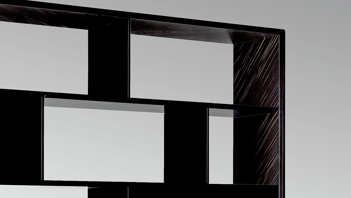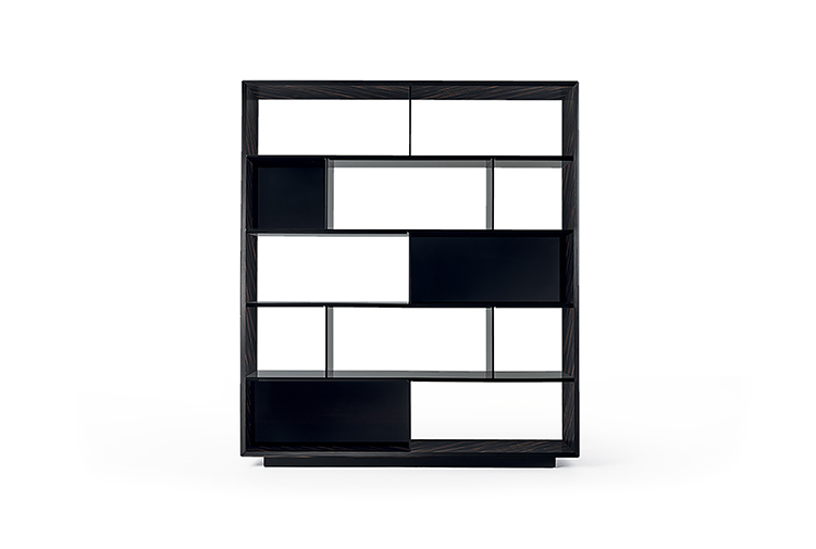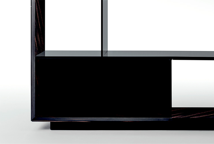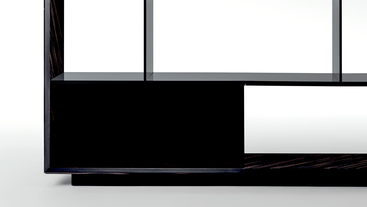 SHELVES AND DIVIDERS Glossy brushed lacquered wood coordinated with the leather. Ebony Macassar version with matt lacquered black wood or glossy brushed lacquered black wood