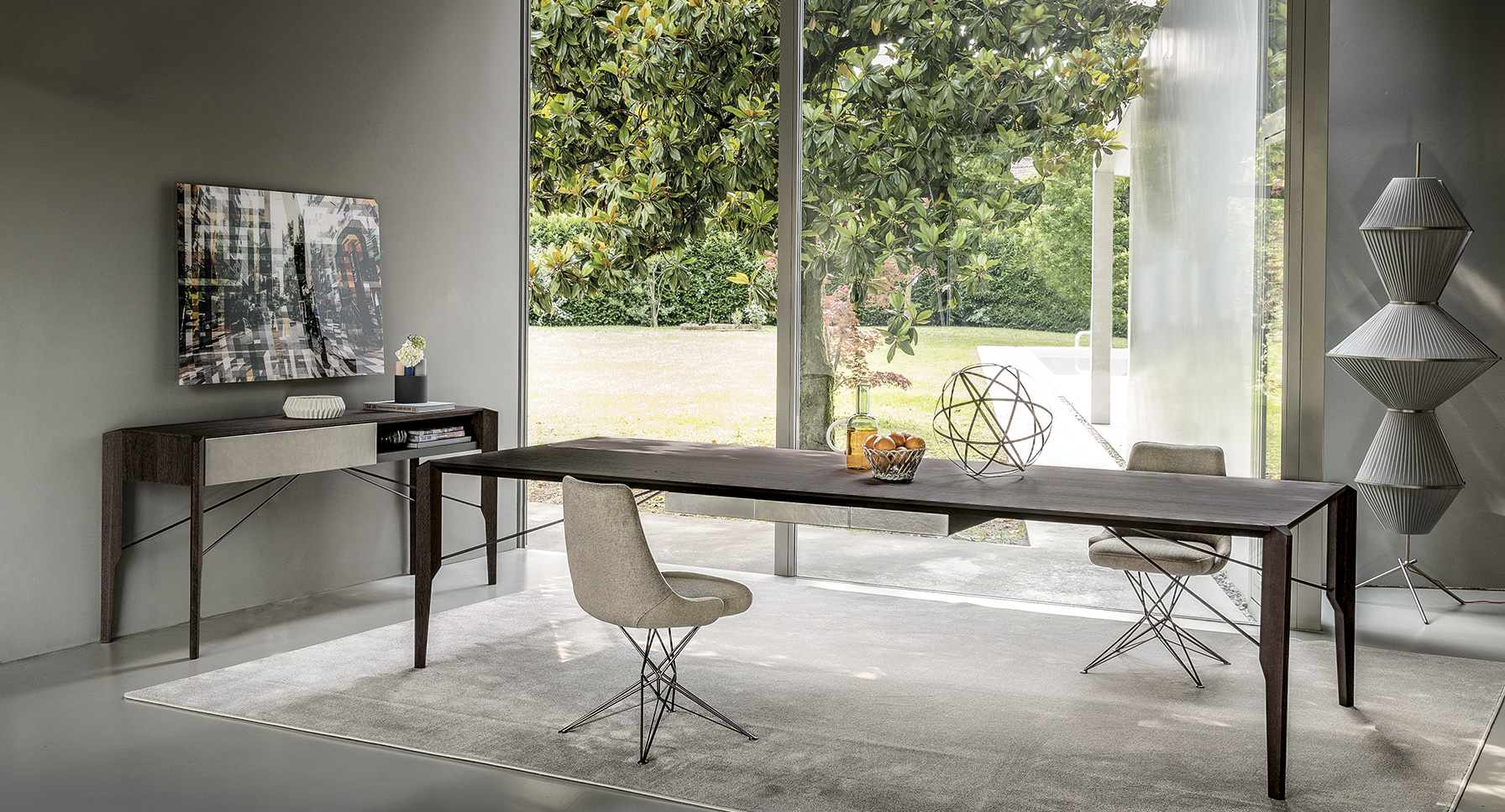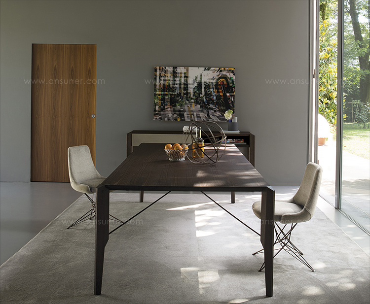 Manzoni&Tapinassi设计的Glorious餐桌运用了最基本的线条设计,以获得极度轻盈的效果。桌面可在摩卡橡木、卡纳莱托胡桃木或苏木皮拉木材中进行选择,桌面下方的抽屉上覆盖有植物鞣制的不同颜色的皮革,可以从强烈的茄皮紫和天然的灰色等各种颜色间进行选择。其独特的特点是每条桌脚上都连接着金属支柱,使其变得薄而又轻盈。