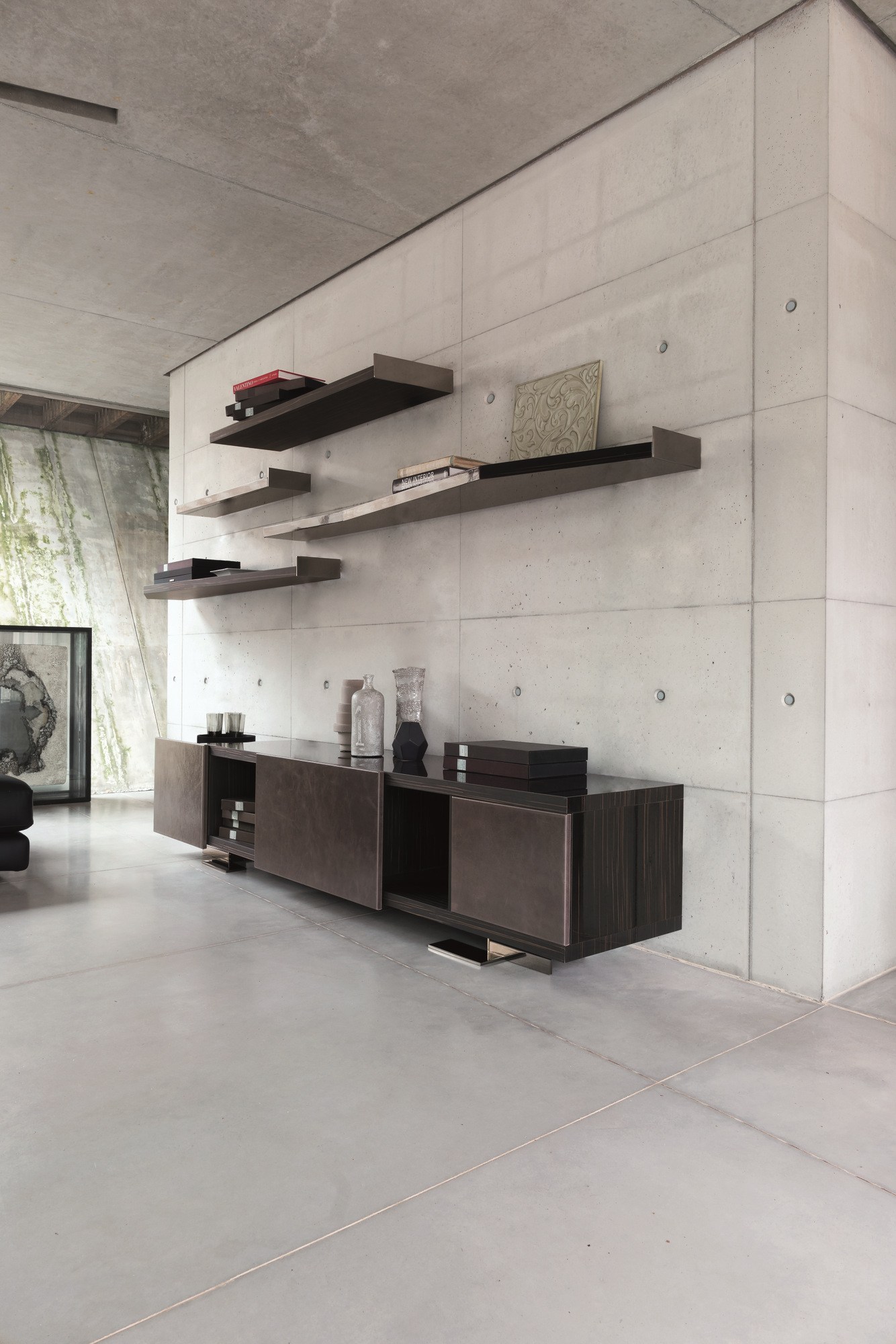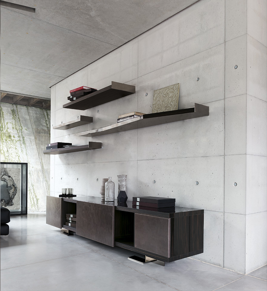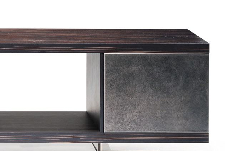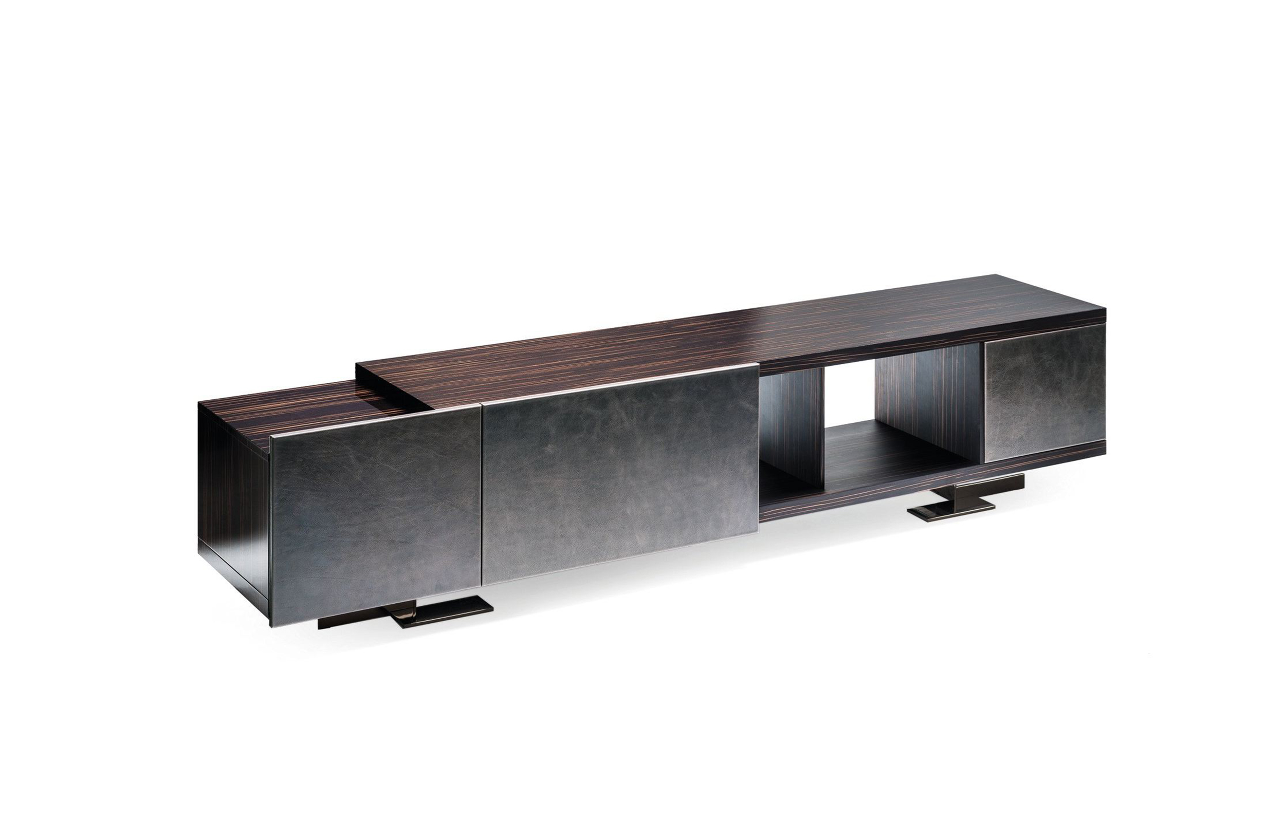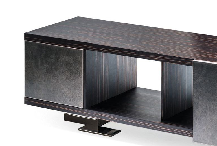 Endor餐具柜的特点是独立而精确的图形设计,就像一个荒岛。由于它的结构和开放的架子,它可以放置在墙壁或客厅。柜体由摩卡橡木、柚檀和乌木制成,柜门上面覆盖了列奥纳多的真皮。金属底座可以用云母棕或黑镍制成。