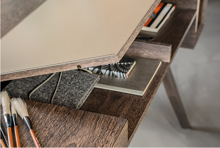 一个线性的、可适应的桌子,桌面配有皮革。这种金属镶嵌的纵横交错的底座让整个作品在纯粹的复古风格中增添了一种现代气息。抽屉的设计赋予了深度和功能,让它不仅是一个工作桌,还可以存放一些私密的文件。