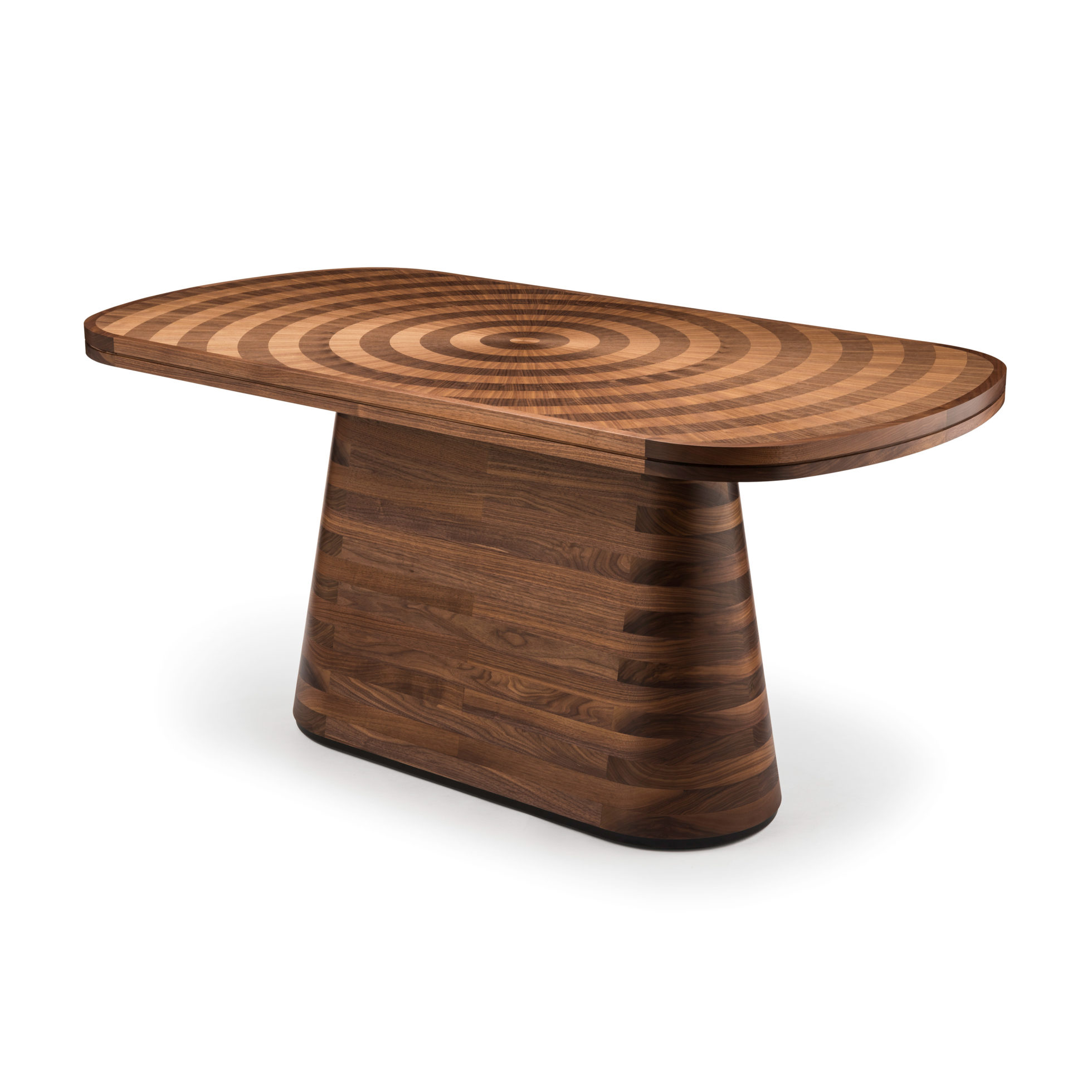 光芒四射的浅色和深色胡桃木饰面突破了我们超凡脱俗的Astral餐桌的表面,它们的生命环仅由坚实的胡桃木装饰和锚固基座限制。