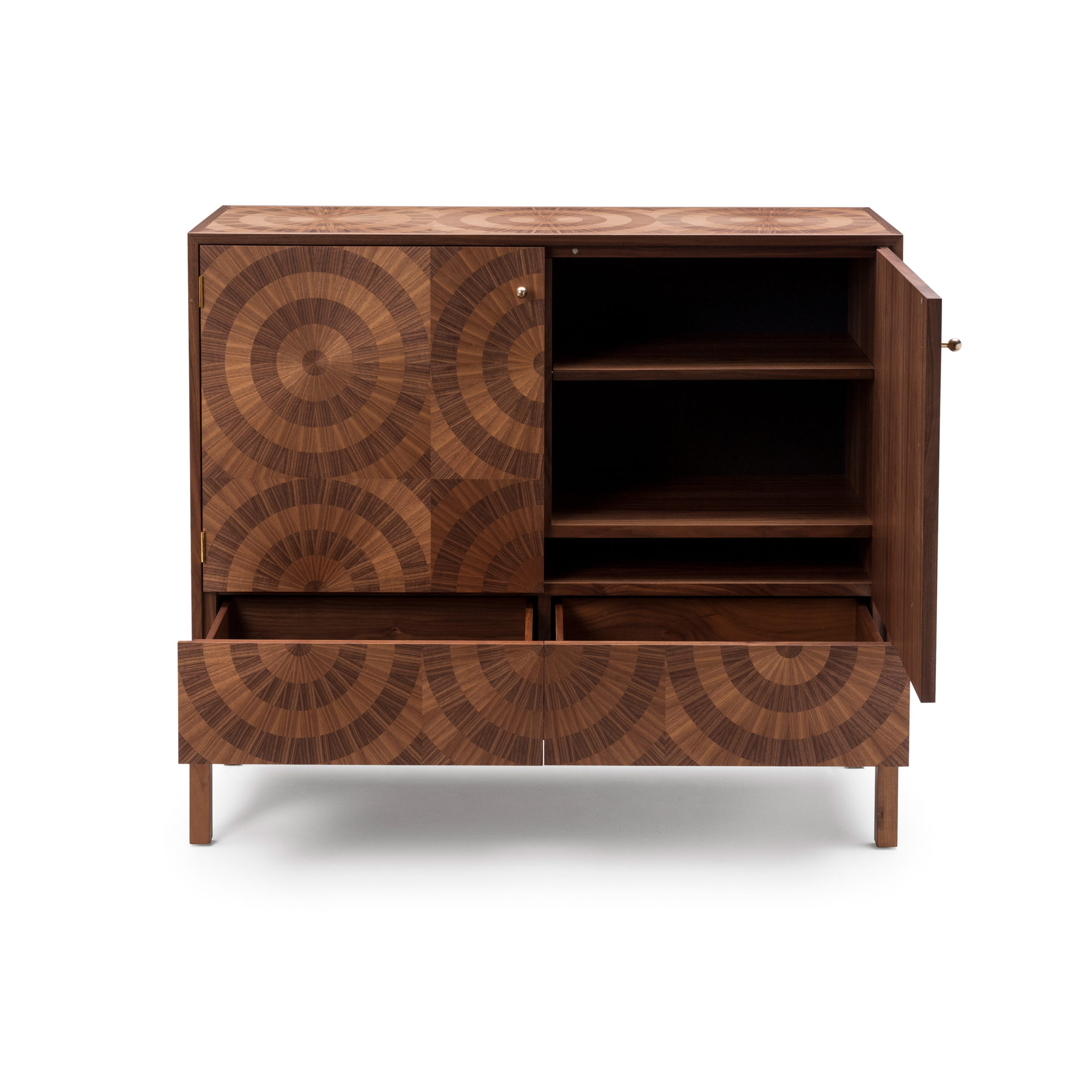 “看着我的眼睛,看着我的眼睛......”,在坚实的胡桃木底座上用两种色调的美国黑胡桃木贴面精心制作,一个简单的成为一个令人着迷的储物柜,随着时间的推移会更加生动。