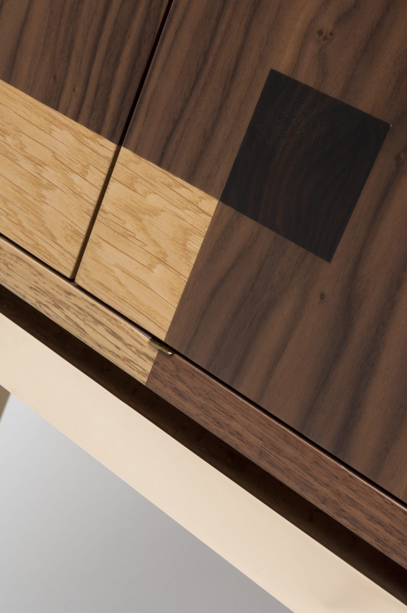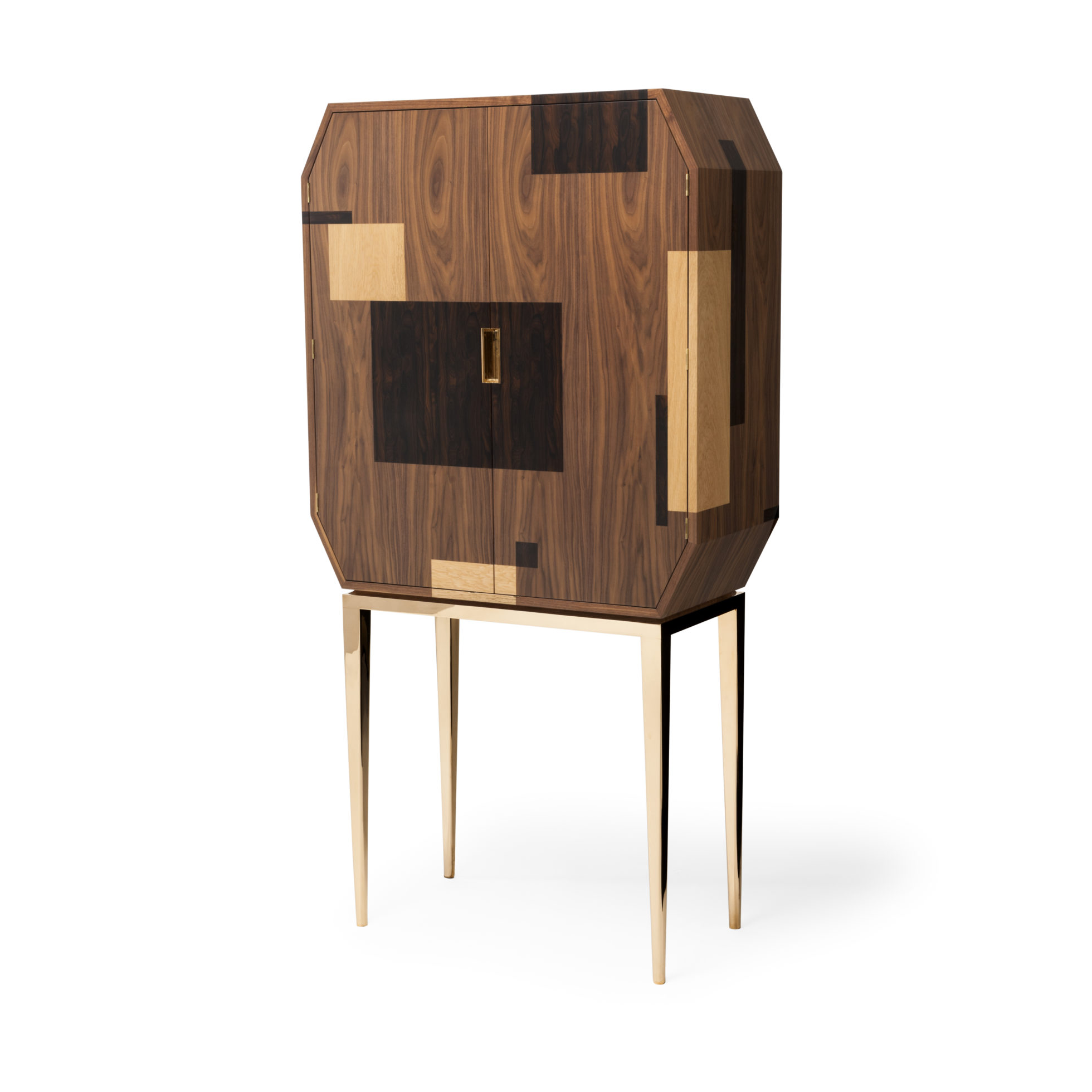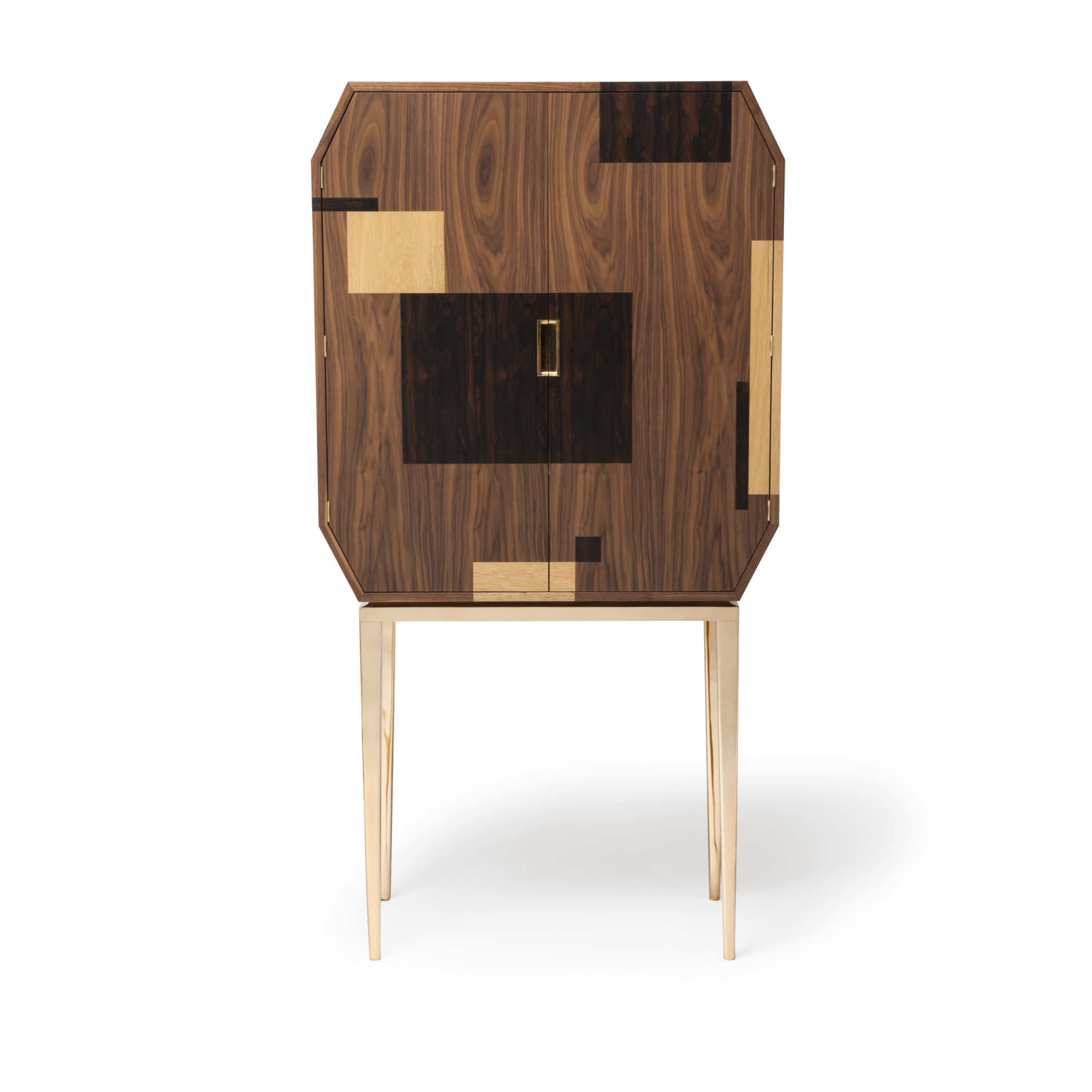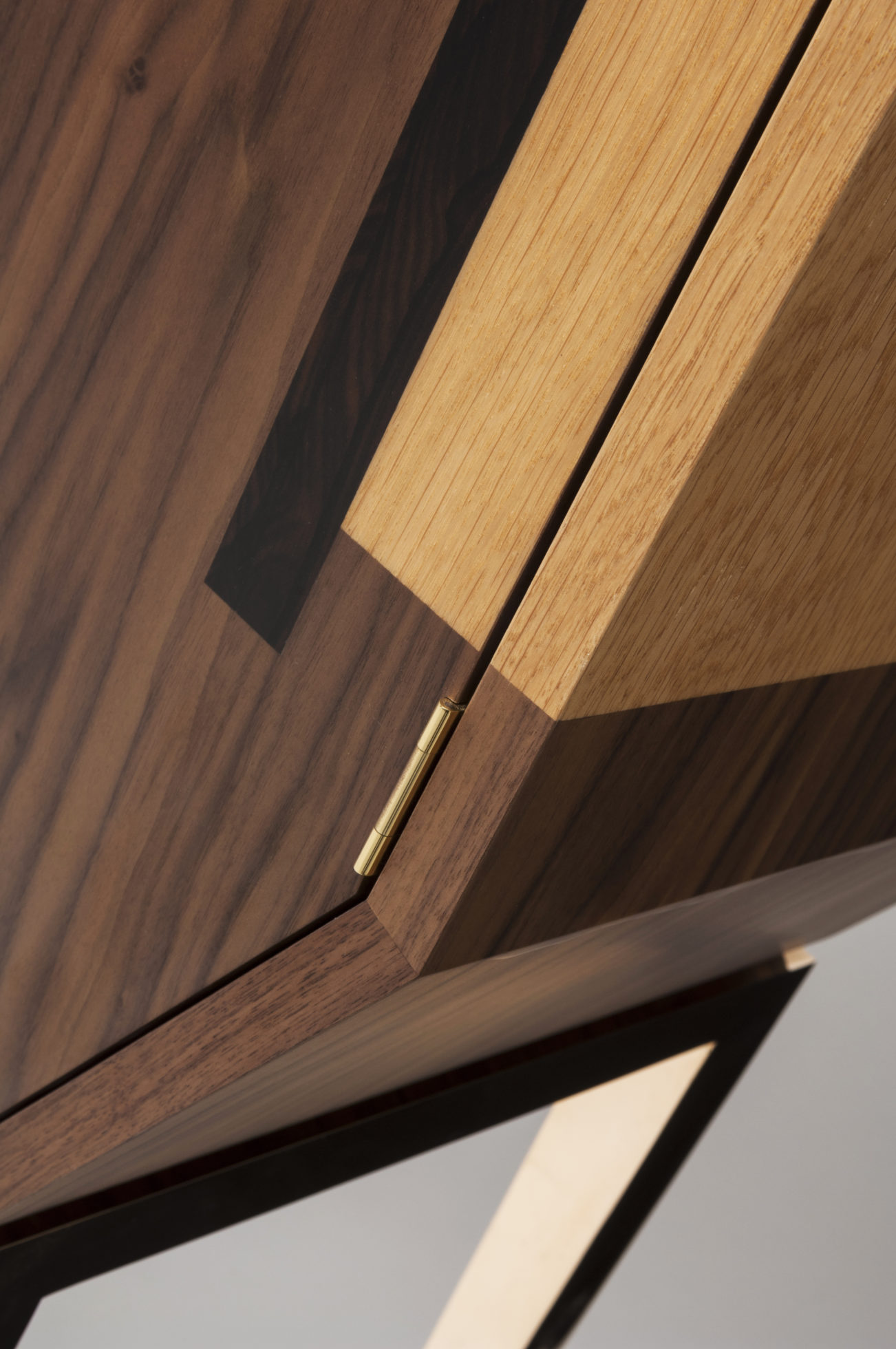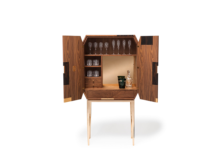 这是一款温文尔雅的饮料柜,采用美国黑胡桃木制成,带有ziricote和橡木镶板以及坚固的抛光青铜腿背板和把手。