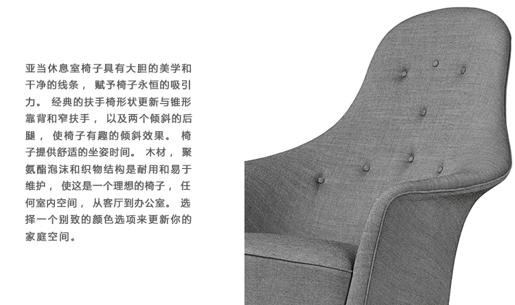 亚当休息室椅子具有大胆的美学和干净的线条,赋予椅子永恒的吸引力。经典的扶手椅形状更新与锥形靠背和窄扶手,以及两个倾斜的后腿,使椅子有趣的倾斜效果。椅子提供舒适的坐姿时间。木材,聚氨酯泡沫和织物结构是耐用和易于维护,使这是一个理想的椅子,任何室内空间,从客厅到办公室。选择一个别致的颜色选项来更新你的家庭空间。