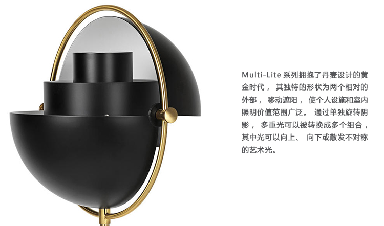 多元文化收藏拥抱了丹麦设计的黄金时代,其独特的形状为两个相对的外部,移动遮阳,使个人设施和室内照明价值范围广泛。通过单独旋转阴影,多重光可以被转换成多个组合,其中光可以向上、向下或散发不对称的艺术光。