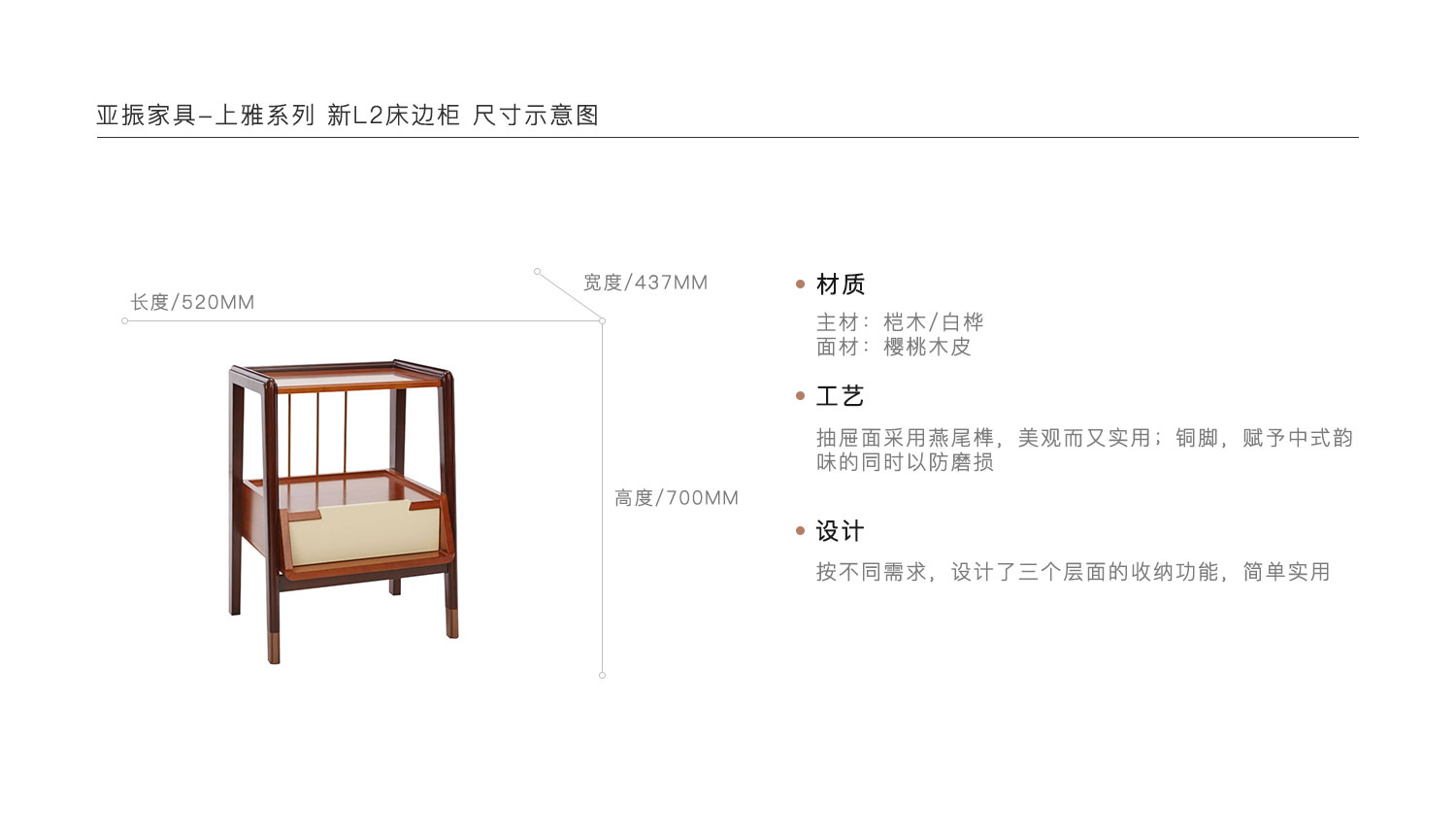 抽屉面采用燕尾榫,美观而又实用;铜脚,赋予中式韵味的同时以防磨损。按不同需求,设计了三个层面的收纳功能,简单实用。