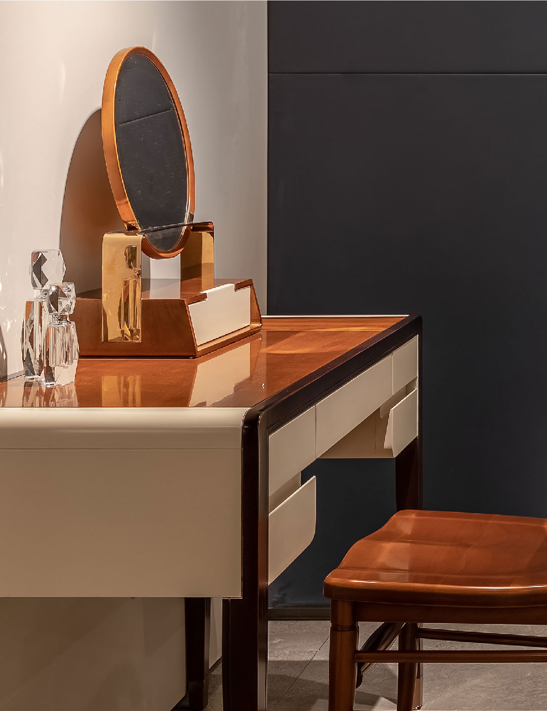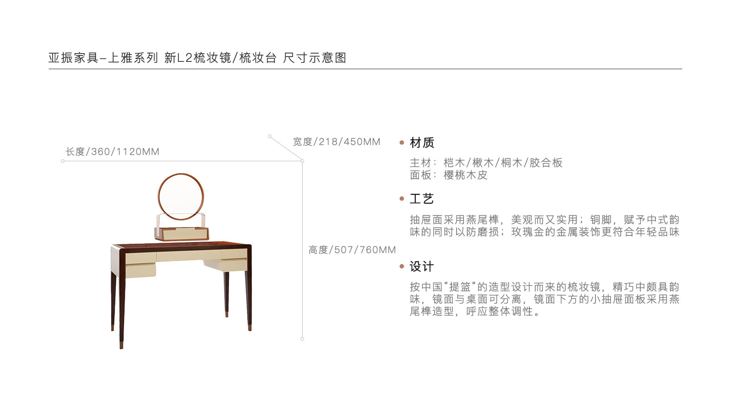 按中国“提篮”的造型设计而来的梳妆镜,精巧中颇具韵味,镜面与桌面可分离,镜面下方的小抽屉面板采用燕尾榫造型,呼应整体调性。抽屉面采用燕尾榫,美观而又实用;铜脚,赋予中式韵味的同时以防磨损;玫瑰金的金属装饰更符合年轻品味。