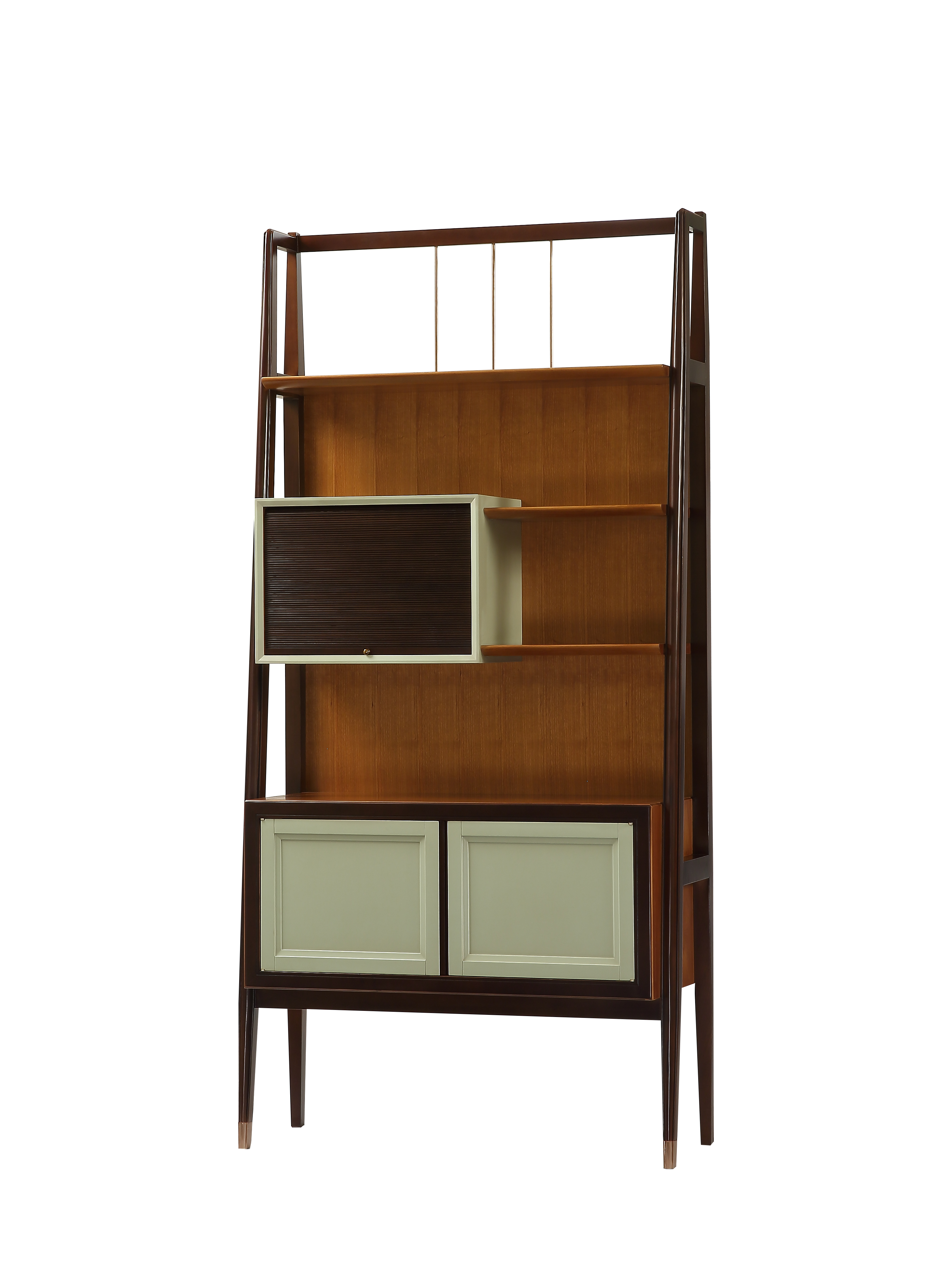 采用燕尾榫造型的拉手,符合成年人手型,不费力即可轻松打开;进口隐藏式铰链;铜脚,赋予中式韵味的同时以防磨损;卷帘门,便于开启。设计灵感来源于中国传统的博古架,同时融入了更多的创新元素,精心设计了卷帘式的开启方式并可灵活移动,还结合了现代智能化的光电感应。