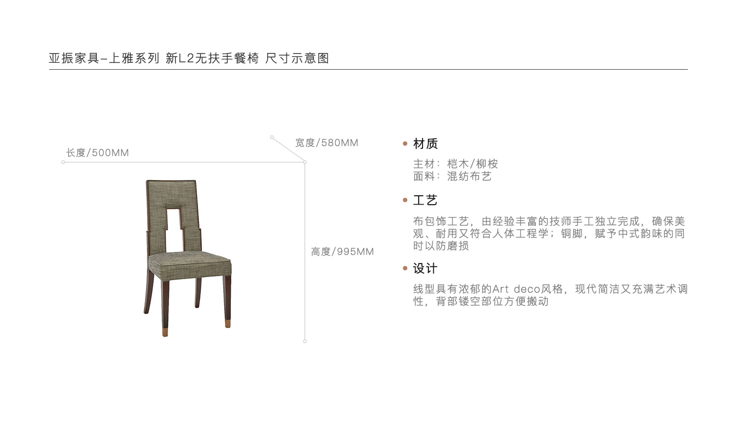 布包饰工艺,由经验丰富的技师手工独立完成,确保美观、耐用又符合人体工程学;铜脚,赋予中式韵味的同时以防磨损。线型具有浓郁的Art deco风格,现代简洁又充满艺术调性,背部镂空部位方便搬动。