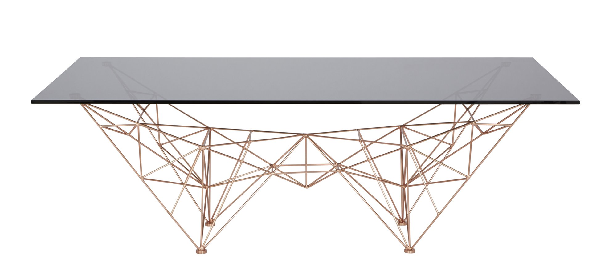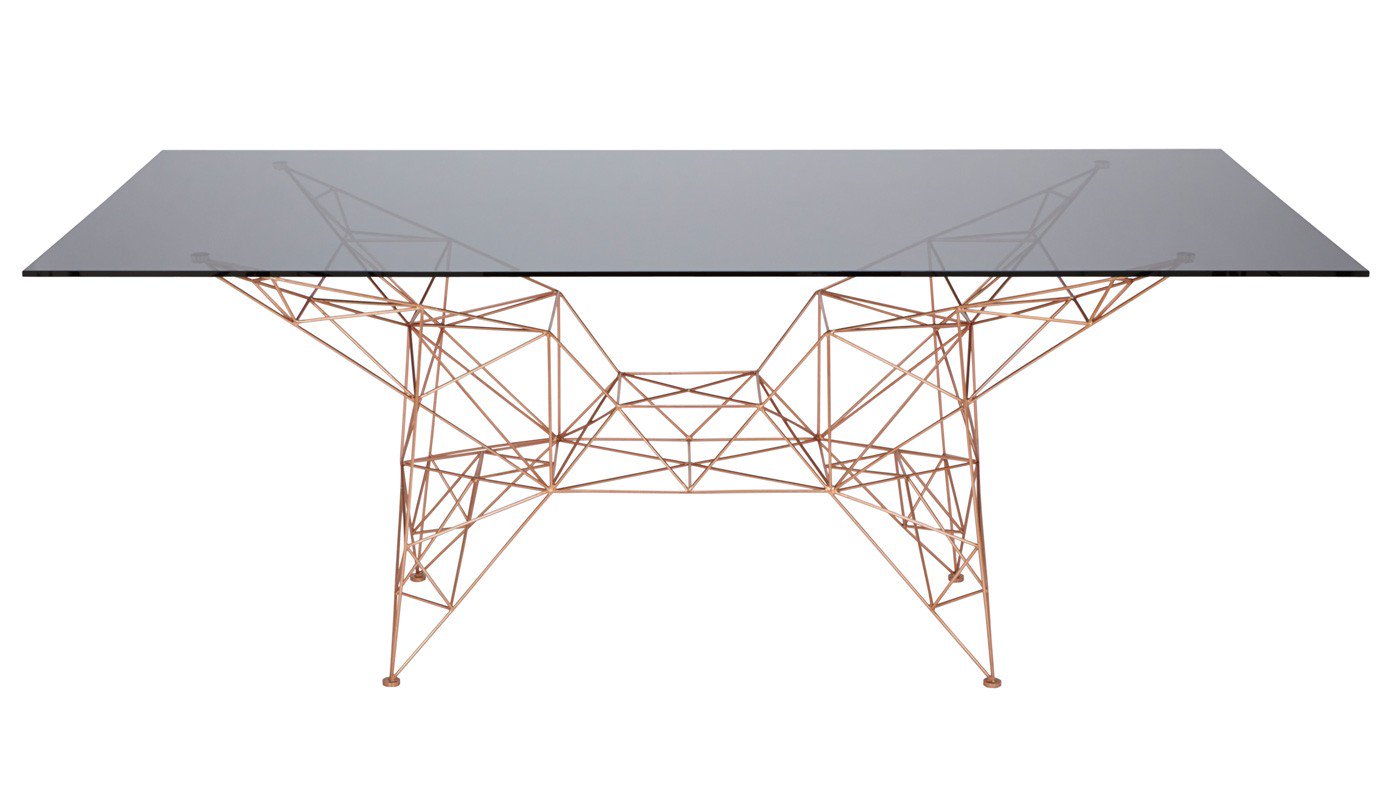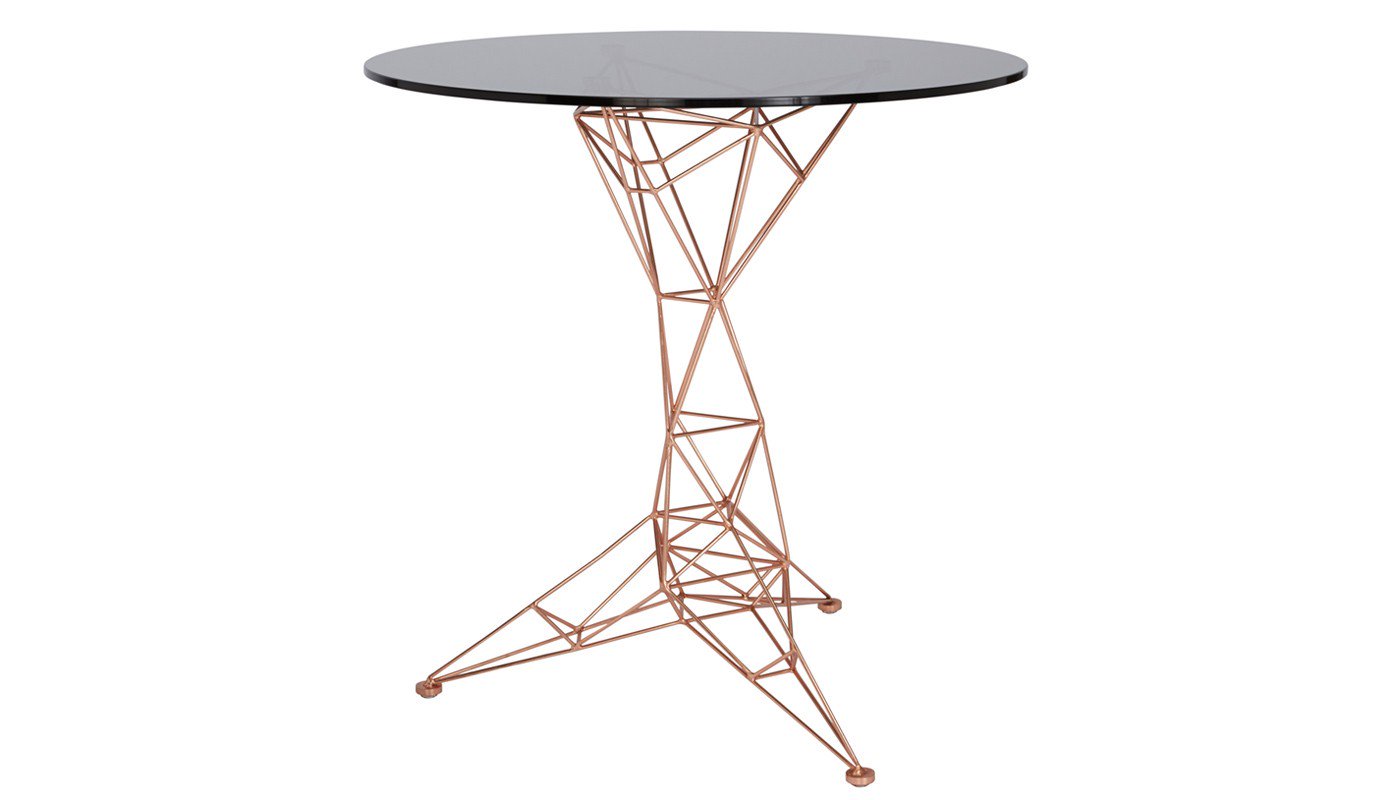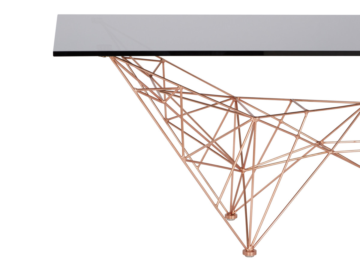 汤姆迪克森的灵感来自桥梁,塔和空间框架创造了这个美丽的塔咖啡桌。塔咖啡桌是一个焊接镀铜钢棒基础和烟熏玻璃顶部的组合。半透明,重量轻,功能强大的雕塑。