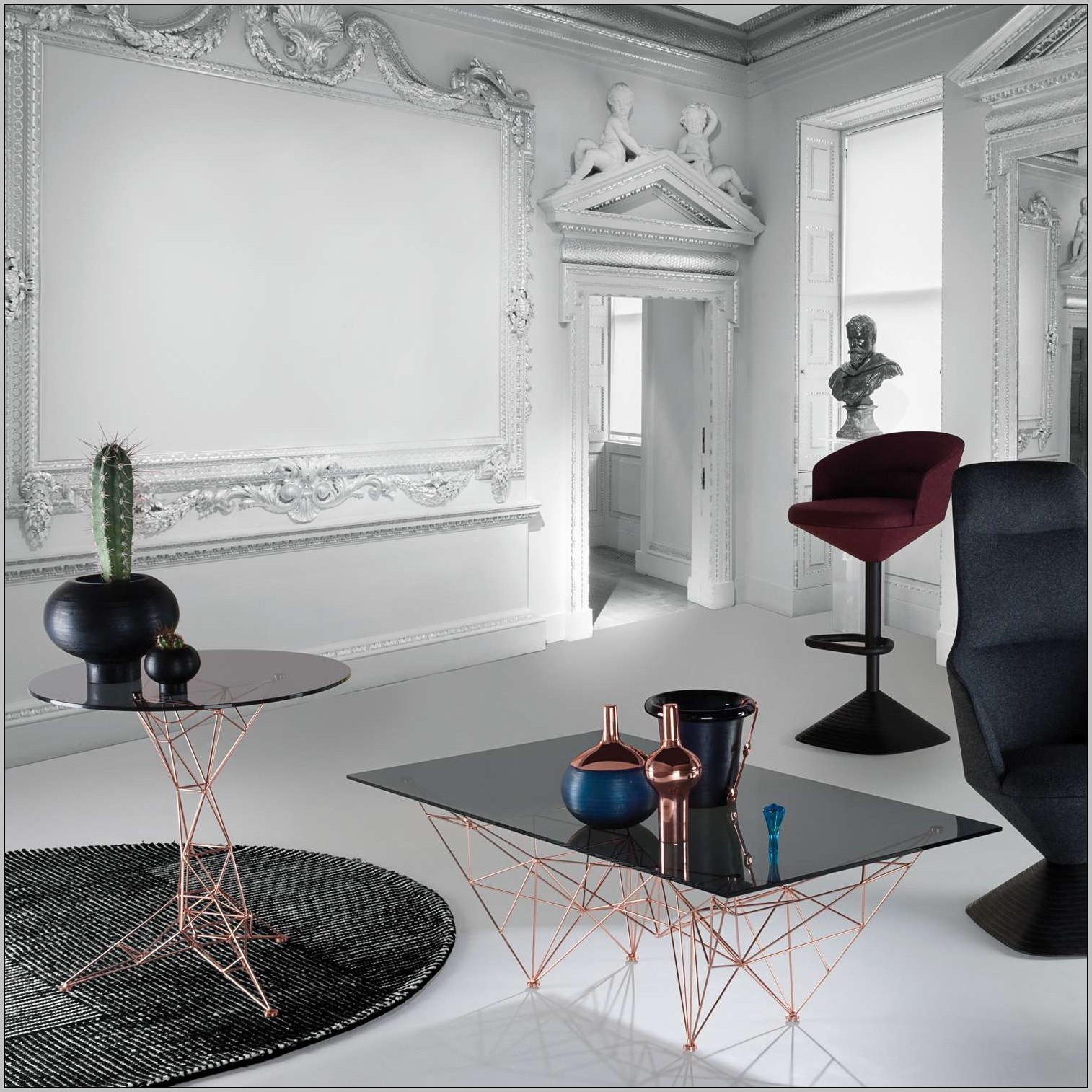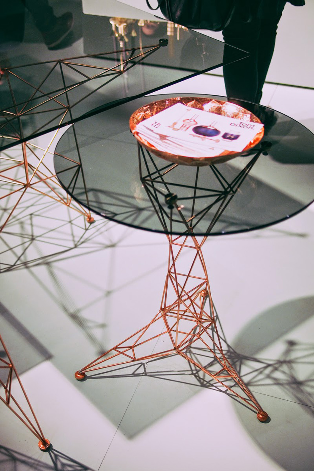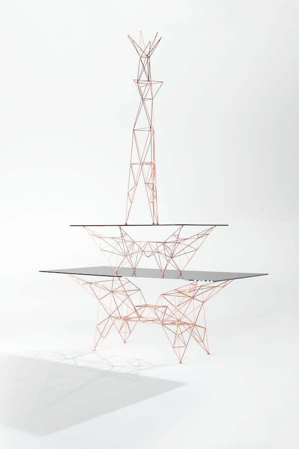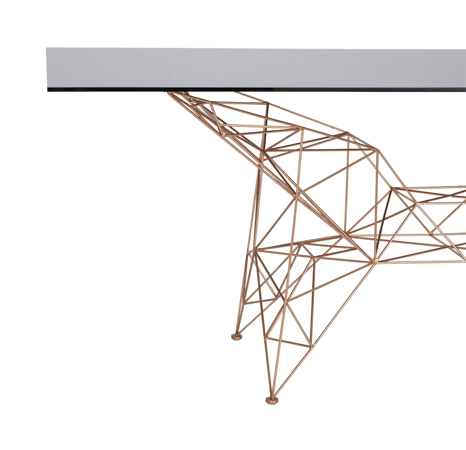 汤姆迪克森的灵感来自桥梁,塔和空间框架创造了这个美丽的塔咖啡桌。塔咖啡桌是一个焊接镀铜钢棒基础和烟熏玻璃顶部的组合。半透明,重量轻,功能强大的雕塑。