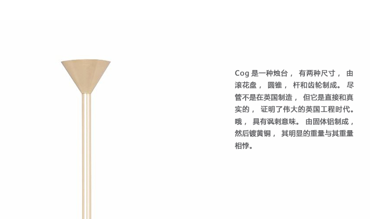 Cog是一个烛台,有两种大小,是由滚花盘,锥,棒和齿轮制成的。尽管不是在英国制造的,但它笔直而真实地证明了伟大的英国工程时代。讽刺的是。从固体铝,然后黄铜镀,它的表面重量掩盖了它的重量。这是一个系列的一部分,伦敦设计师汤姆·迪克森(Tom Dixon)的作品,探讨我们不断变化的关系与工业景观。它暗示着一切事物的小型化,以及器皿的无止境的软化,使我们忘记了工业曾经是巨大而不妥协的,吵闹和喷涌,其残酷的美丽令人恐惧,同时也是现代信息时代的先兆和先驱者。人们想了很多,但说的还不够多,汤姆·狄克逊的确是这样的