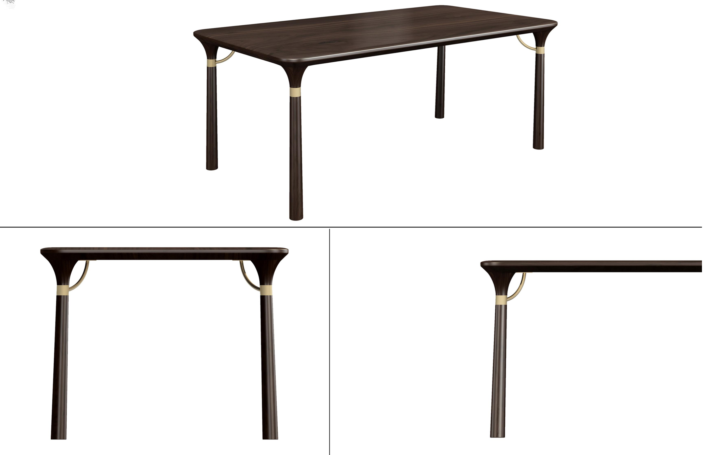 1.餐台造型简洁精巧,源于明式家具形制,以线为主,通透灵动。 2.餐台四角采用中式传统家具中霸王枨造型,同时以铜制装饰,稳固大方,美观典雅。