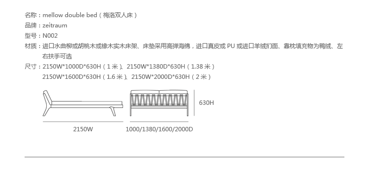 德国家具厂牌 ZEITRAUM 讲究的不仅仅是家具,它着重的是一种"生活态度",每件 ZEITRAUM 家具除了需具备实用、耐用、容易搭配的基本要件,更重要的是可以衬托用户与空间的个性,简约取代夸张花俏的线调,细腻精巧的做工低调传递设计师缜密的设计思维。ZEITRAUM 使用来自永续森林的落叶型硬木,表面以有机油/蜡涂装,完全不使用化学物质,让用户与家具在空间自由呼吸。mellow double bed(梅洛双人床),由丹麦设计工作室Formstelle设计,水曲柳或胡桃木或橡木实木床架、床垫采用高弹海绵,高级真皮或PU或羊绒扪面、靠枕填充物为鸭绒。Formstelle赋予了这章程轻松、 舒适、 自然的感觉,让人有家的安逸舒适。