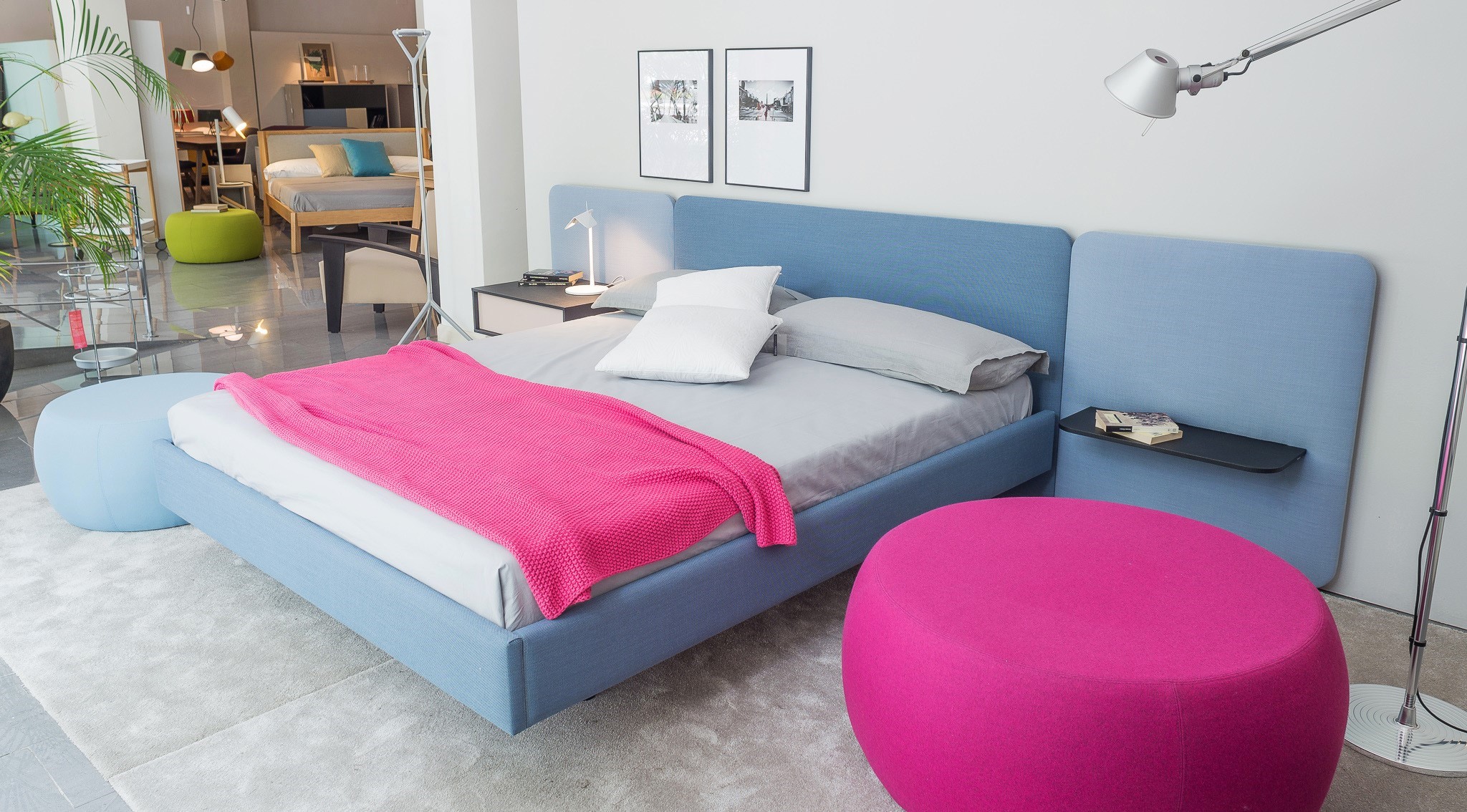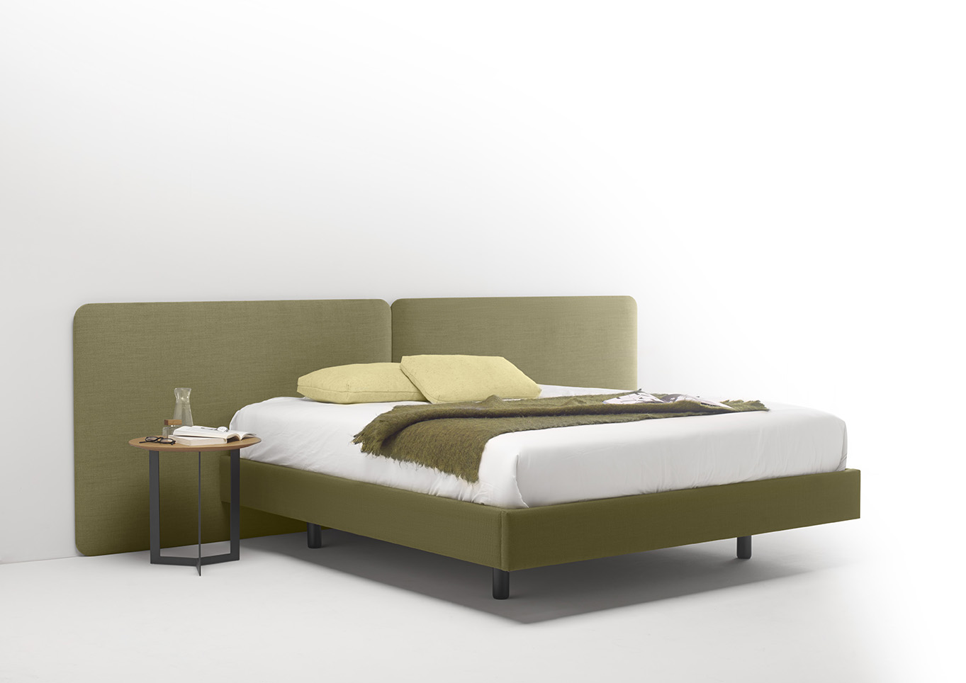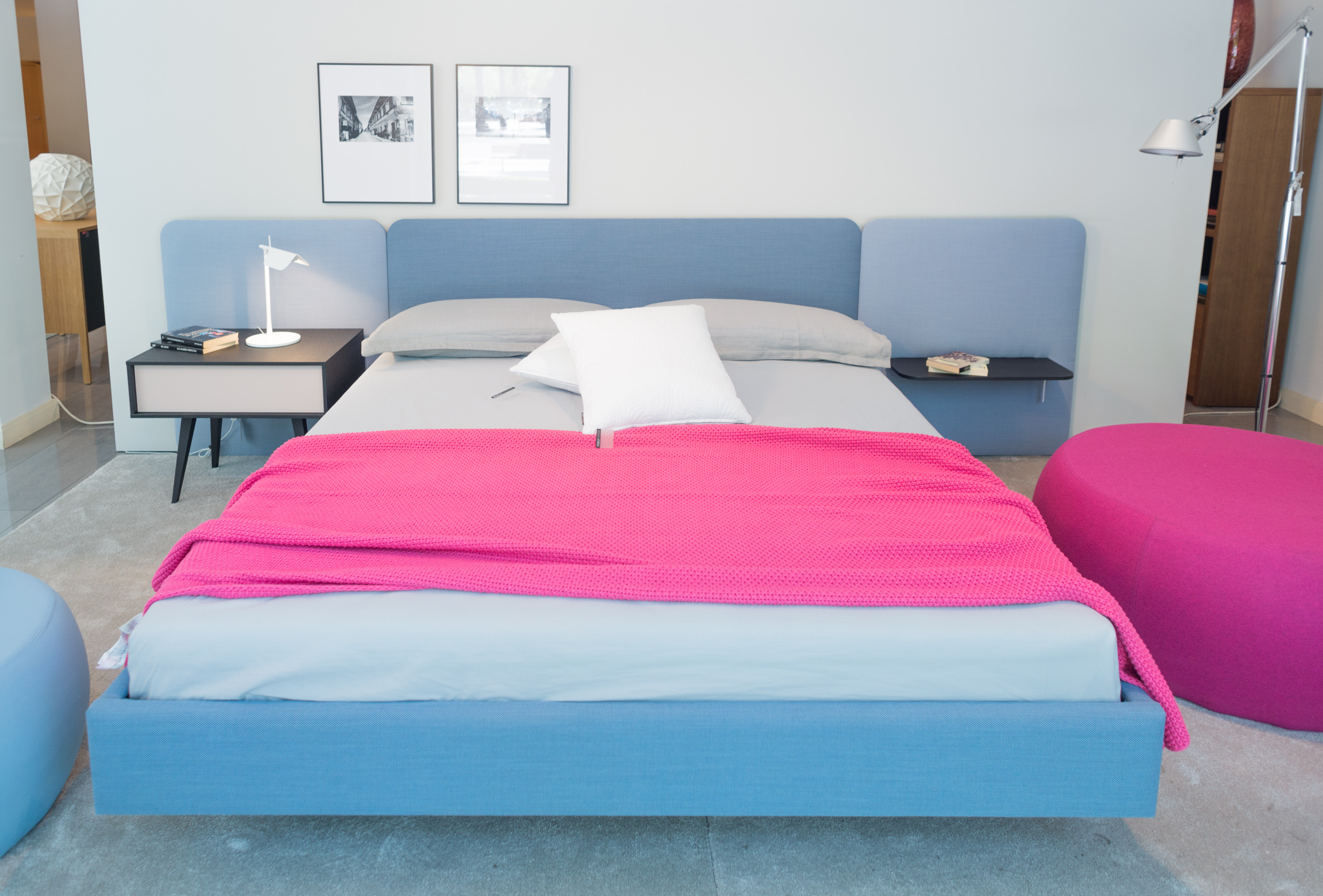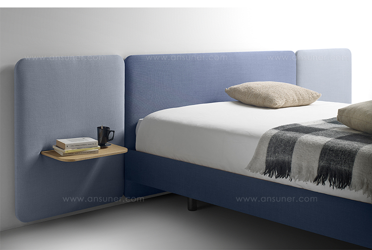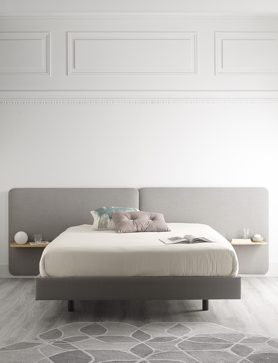 不同宽度和高度的圆形嵌板,不同颜色的织物组合,浮动的书架和有抽屉的床头柜:用Lota系列为你的卧室增添你的个人风格。