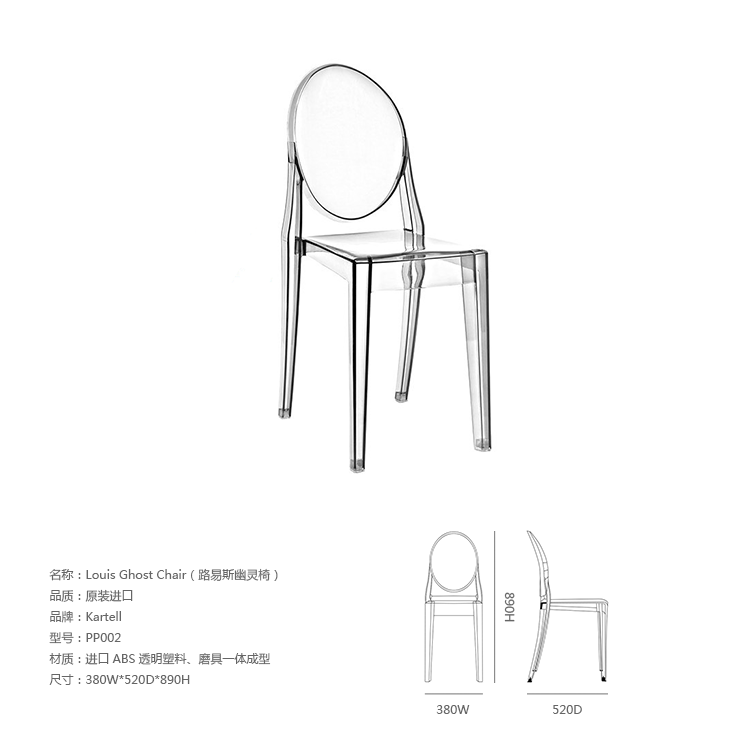 "Charles Ghost Stool(查尔斯鬼凳),由鼎鼎大名Philippe starck(菲利浦·史塔克)设计;进口高透明度工程塑料PC一体成型,简洁新潮,高净度透明材质很好的表现出产品的时尚和百搭,可以毫不夸张的说,几乎配任何装修风格他都很灵,而且显品味,空间感也很好,如果你的吧台空间不大的话,放这款吧椅视觉很通透,不占地方。"