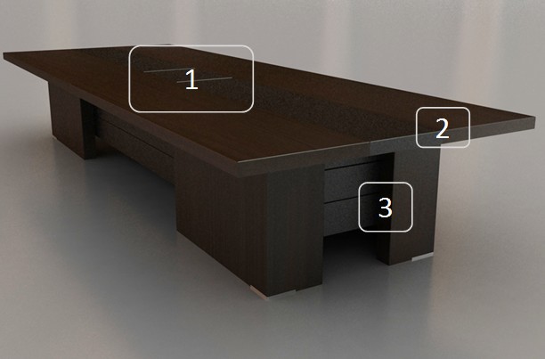 2、会议桌面板两侧表面装饰木皮,中间喷涂黑色哑光漆
