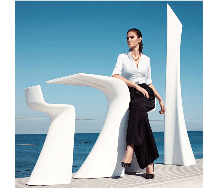 "翼系列包含翼台和翼吧凳,由设计大师oaquín Torres和Rafael Llamazares设计,它造型以一种动态的方式将直线和曲线编织在一起。这些极端曲线和角度,在最新的体系结构中,已经达到了家具设计典范,通过运用自由的、 微妙的、 有机的线条,以运动的形态,分离本身刚度。这些都是大胆的创新,构成了巨大的视觉冲击,令人印象深刻,达到雕塑和动态意义。"
