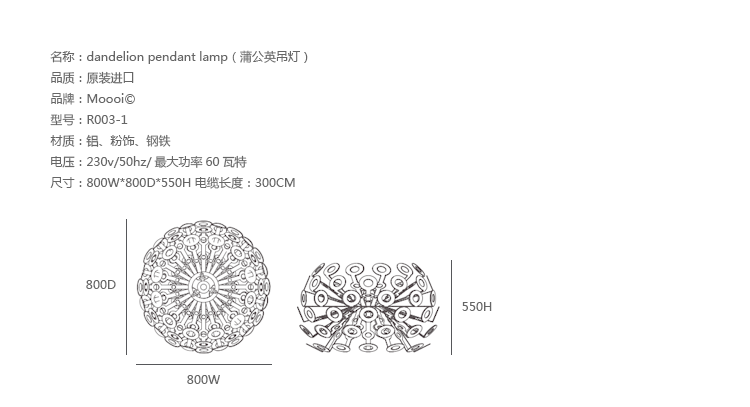 "True to its name,Dandelion was initially inspired by the plant the creates the famous and poetic "dandelion snow" of fuzzy,cotton-like seeds when a gush of wind blows on it.The lanp transmits an explosive feeling of energy in motiom,reaching towards us from its lighten up and blow away the heaviness of everyday life.Dandelion is truly a breath of fresh air."