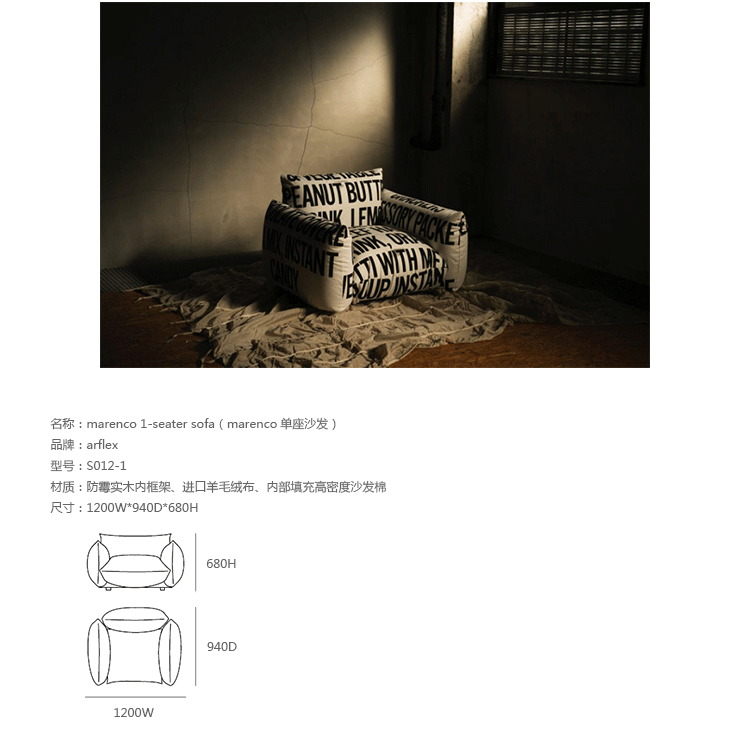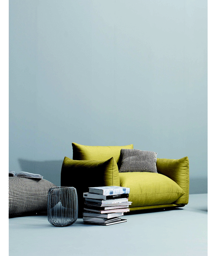 "marenco sofa系列沙发由设计师Mario Marenco在1971年所推出,Arflex公司出品,有单座,双座,三座,和五座组合形式。这款经典的沙发线条经典,舒适度饱满,成为摩登家居用品经典作之一。外型以简约细腻的北欧设计为方向,轻盈的金属脚架与薄型扶手,在厚薄粗细之间,视觉比例的层迭丰富,融合义式沙发中柔软舒适的元素,靠垫内衬高密度泡棉,兼具支撑性与松软度。这套沙发采用革命性的方式组合,垫子及扶手都是独立的部分。枕头是挤压钢管的金属框架,提供了刚性和耐用性。胶合板基地加上纤维覆盖。制作采用防霉实木内框架、进口羊毛绒布、内部填充高密度沙发棉,保证了高品质的奢华与舒适。