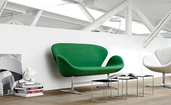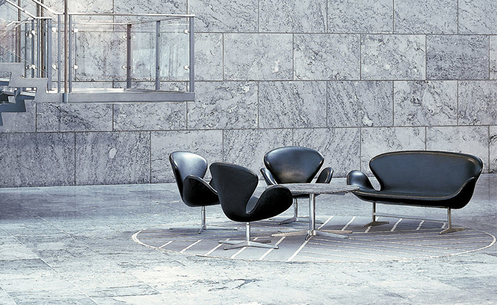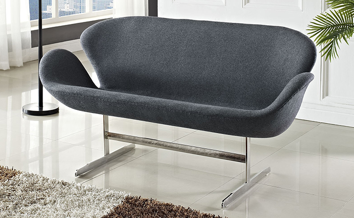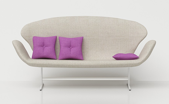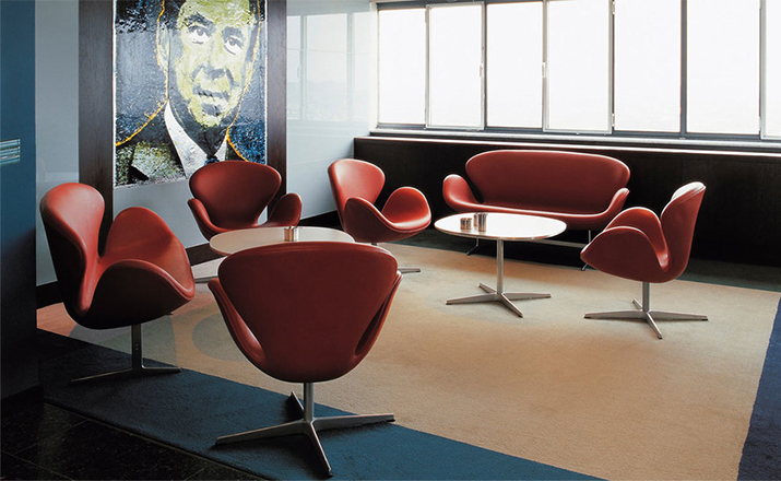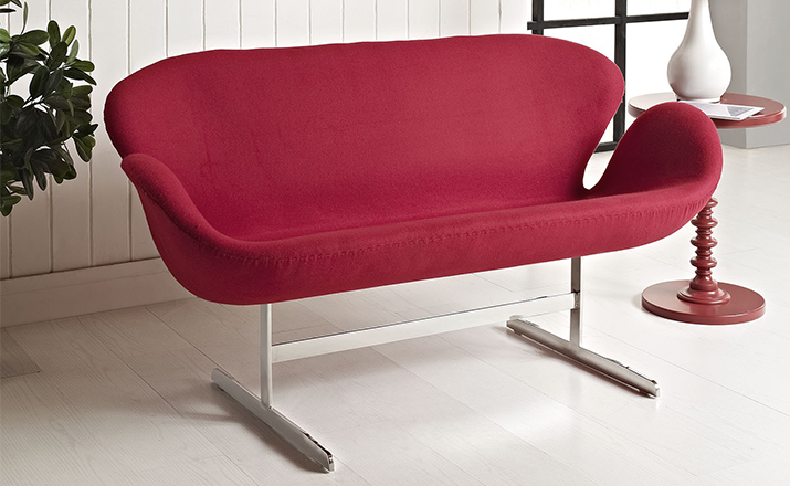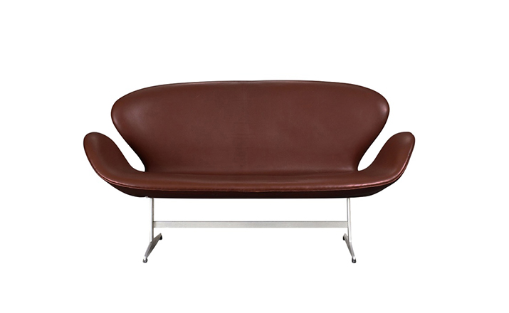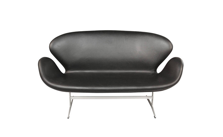 1958 年,Arne Jacobsen为哥本哈根皇家大酒店21楼房间的套房、 休息室和全景房设计的这套Swan Sofa(天鹅沙发)。天鹅沙发是两个坐席版本的天鹅椅,这个优雅的沙发设置在铝振动筛脚架上。优雅的和有机的形状非常适合休息室和等候区,以及家庭。雅各布森作为一个著名建筑师,同时也是一位非常成功的工业设计师,他为丹麦著名的FH家具公司〔FritzHansen〕设计了一系列座具家具,都成为市场欢迎的畅销产品。他的家具设计作品都是享誉国际的经典设计,天鹅椅就是其中之一;他将自由流畅的雕刻式塑形,以及北欧设计的传统特质相结合,使其作品具有质感非凡与结构完整的特点。天鹅椅制作采用玻璃钢框架内胆、内部填充高密度沙发棉、表面扪高级进口羊绒布料或PU或真皮、铝合金脚架(可振动)。