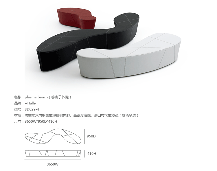 Plasma bench(等离子体凳)是丹麦设计师busk+ hertzog为Halle品牌创作的。Plasma是一个弯曲的概念性的公共座椅。等离子体凳的功能性能非常完美的融入环境,可以单独使用,也可以以不同的组合形式去营造独特、与众不同的空间。4种不同大小尺寸使之很容易表达功能性和各种可能性。最大的等离子体凳超过三个半米长,同时允许多达 10 人的就坐。有机的形状在功能性上表现出强烈的优点,例如大家可以面对面,也可以背对背,可以保持近距离交流,也可以保持一定的私人独立空间。可选的对比拼接提供独特的创造性的组合。Plasma bench(等离子体凳)是IF Design Award和The Good Design Award获奖作品。