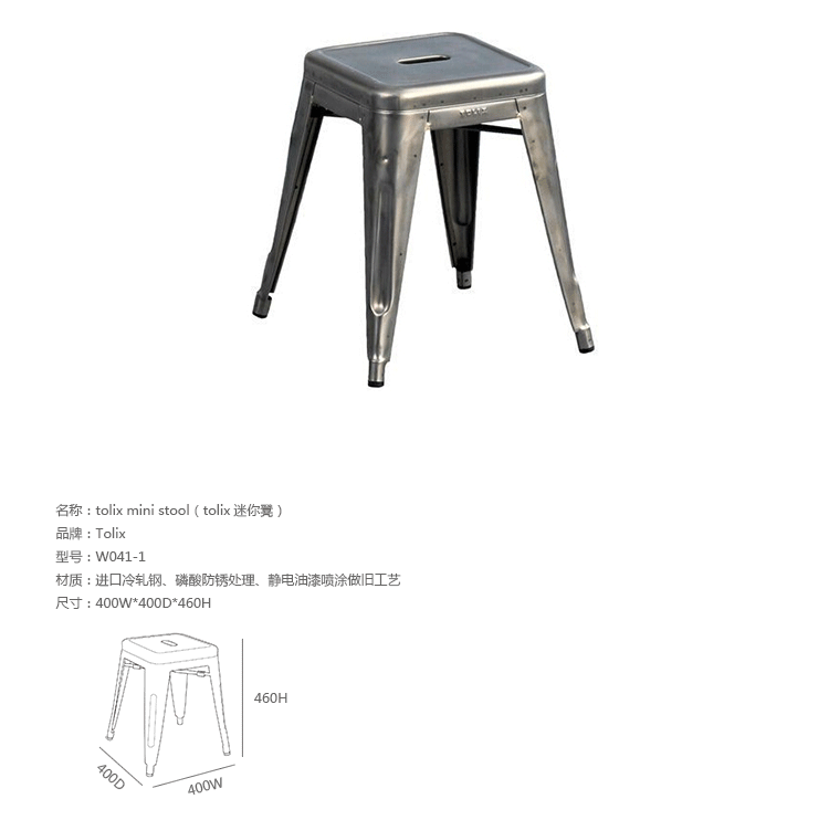 tolix chair(tolix椅)一把有味道、有态度的椅子,据说它最开始被使用在一艘战舰的天气预报房间里,故事的真实性与否不得而知,但是不影响其成为享誉世界的著名设计家具,1934年由Xavier Pauchard设计,早期是作为户外用家具设计,力图展现法式慵懒而闲适的气质,经年而来被全世界时尚设计师所宠爱,从室外扩展到家居、商业、展示等多个用途,而此椅也不负众望在各类空间中均有上佳表现,特别是近年来与混搭、乡村、美式、怀旧、北欧简约、中式等主要装修风格搭配,都呈现出独特的韵味,也被时尚界赞为“百搭第一”椅,可以用在酒吧,餐馆,咖啡馆等等地方,之后通过改进,设计出有扶手版本的tolix armchair(tolix扶手椅),高背版本的tolix high back bar stool(tolix高背吧凳),宽背版本的tolix wide back bar stool(tolix宽背吧凳),及tolix bar stool(tolix吧凳)和tolix mini stool(tolix迷你凳)。制作采用进口冷轧钢、磷酸防锈处理、静电油漆喷涂工艺、坐面为木板或PU海绵坐垫,颜色可选。