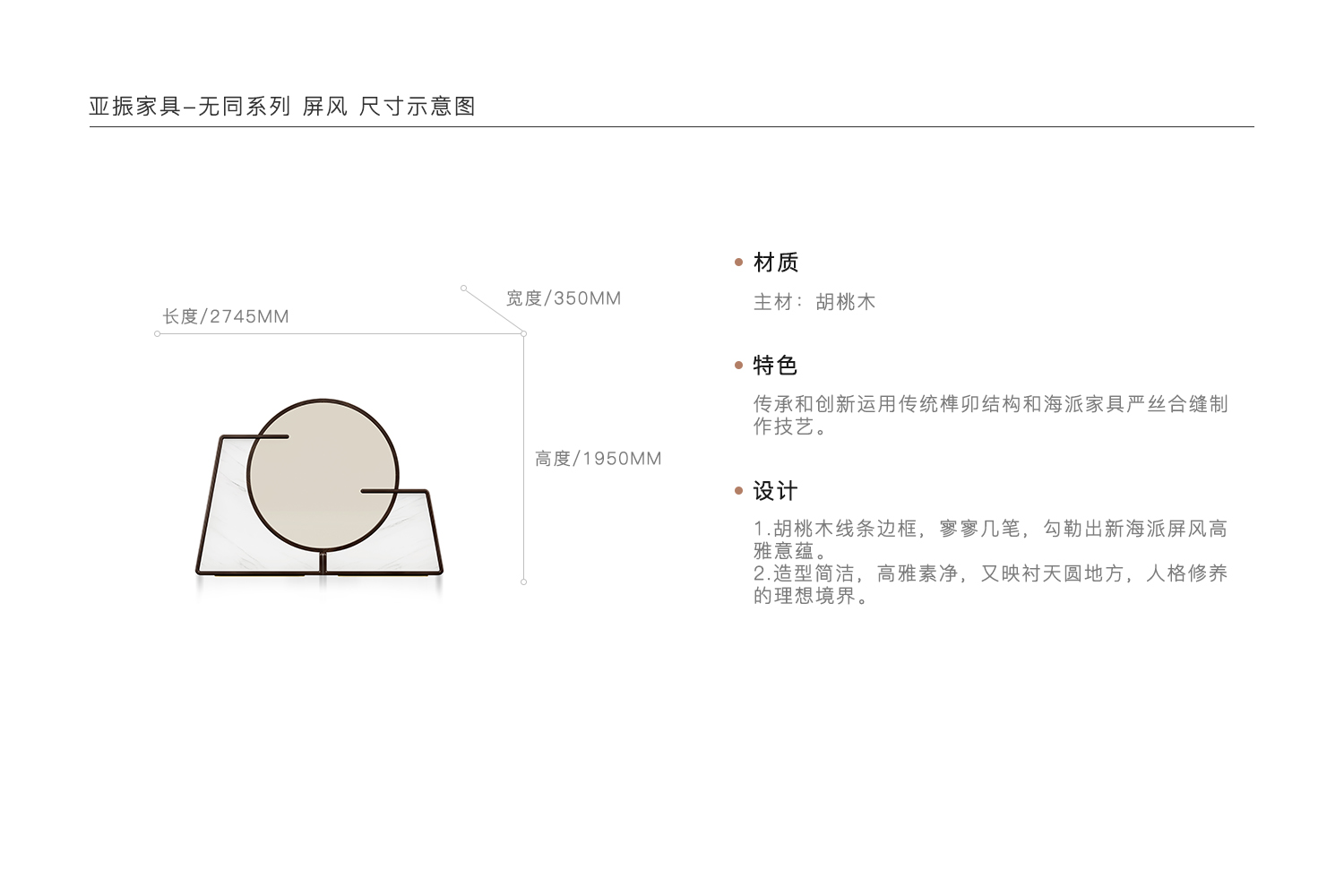 1.胡桃木线条边框,寥寥几笔,勾勒出新海派屏风高雅意蕴。 2.造型简洁,高雅素净,又映衬天圆地方,人格修养的理想境界。