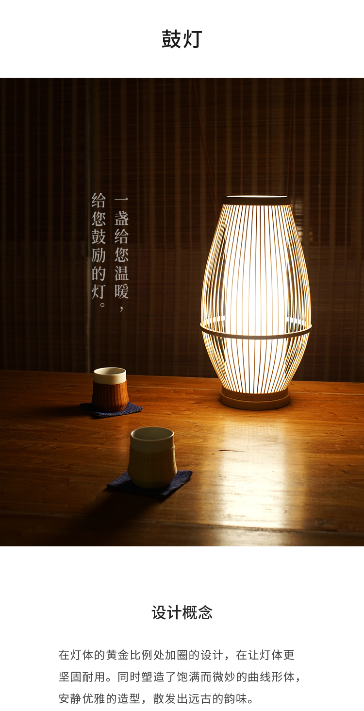 在灯体的黄金比例处加圈的设计,在让灯体更坚固耐用。同时塑造了饱满而微妙的 曲线形体,安静优雅的造型,散发出远古的韵味。鼓灯工艺的历史可追溯至南宋高 宗时期,其具有丰富文化底蕴,纤细、优美和强韧的特点,适合玩赏。清远市沙河 鼓灯工艺是广东省非物质文化遗产。