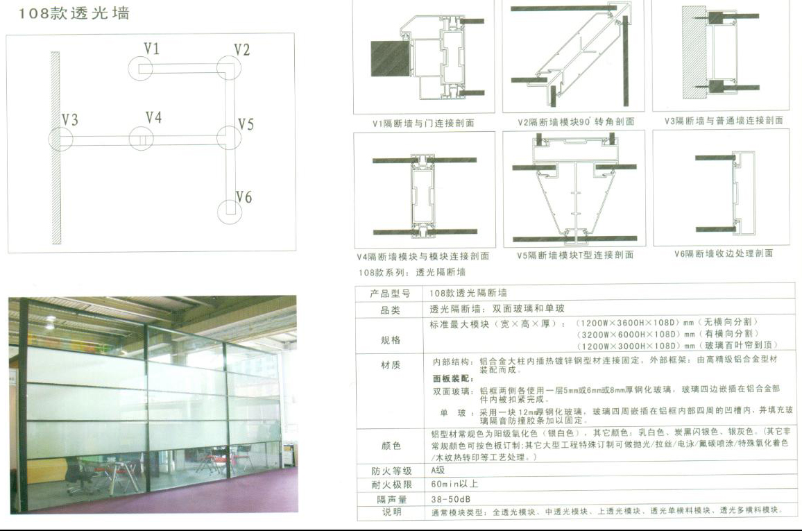 特点是铝框两面装玻璃或面板,玻璃采用6mm钢化玻璃,面板基材采用9mmKM板,或采用实木等装饰面板,其材质选择丰富多样,可任意搭配。 可以内置百叶帘,增加了空间的灵活私密性,(为防止百叶帘变形,其跨度限制在1.3米之内)。 铝框中间横向、竖向压条为30mm,四周壁槽为40mm,侧柱30mm,有时,为了方案设计需要,侧柱可以当壁槽使用。 设计风格简约、大气、稳固。 108款双面高隔断包含:108款双面常规高隔断、108款双面防火高隔断、108款60mm踢脚内钢外铝高隔断。 |