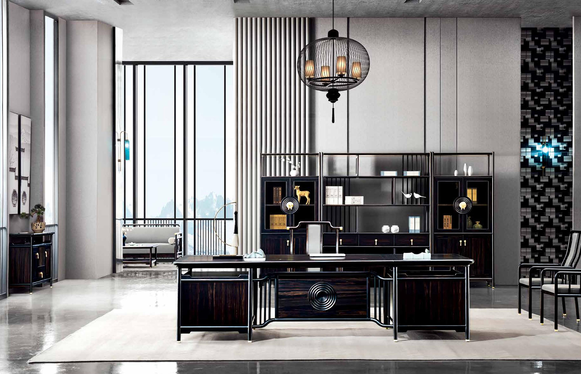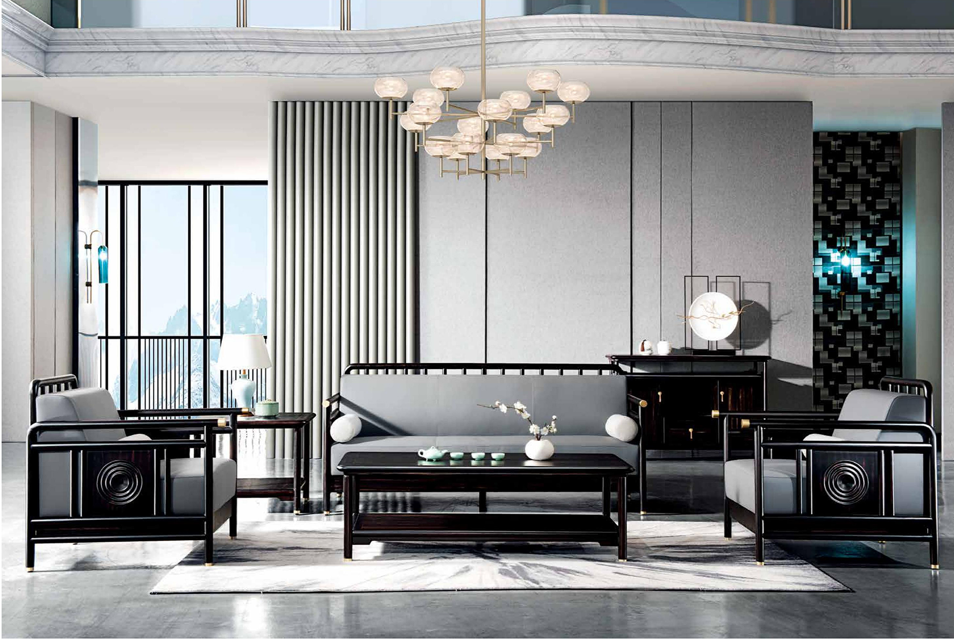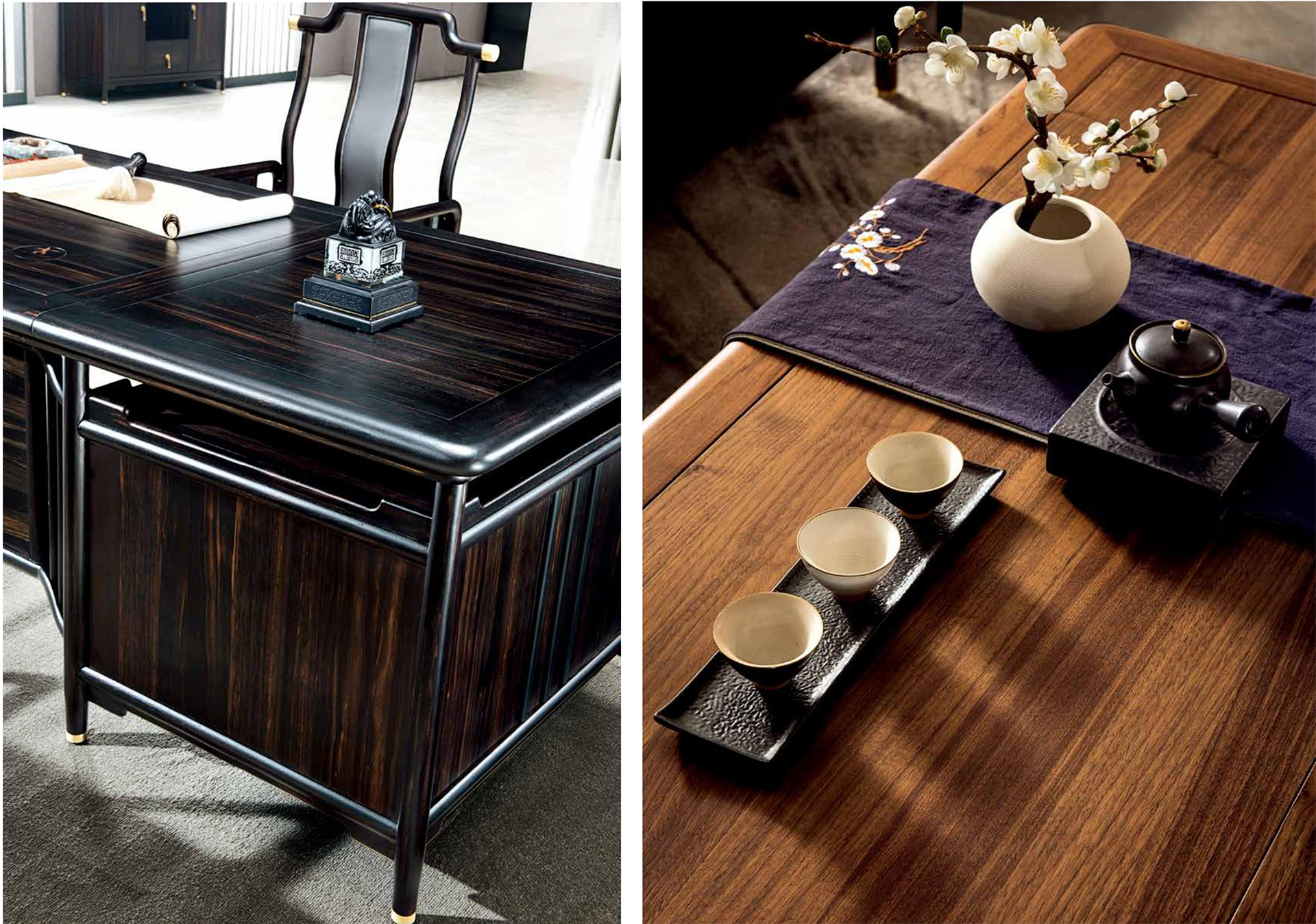 【尚善若水,至柔至坚】 水为至善至柔“水性绵绵密密“微则无声,巨则汹涌·与人无争却又容纳万物“水有滋养万物的德行“却不与万物发生矛盾“冲突“人生之道“莫过于此,【明月清风】系列汲水之灵韵“将水波纹艺术化铭刻于案桌之上“祝福它的拥有者处世尚善若水“成就无所不达。 【世事如茶“品味人生】 明月清风满是诗·一茶一椅品情谊“散发着明式文人气息的沙发“茶几 被国际化的轻奢主义提炼成一种韵味独特的时尚优雅 黑檀色的奢华气息 黄铜饰件的尊贵亮泽 此时此刻“一人独酌还是相约言欢 品一份成功者独有境界。