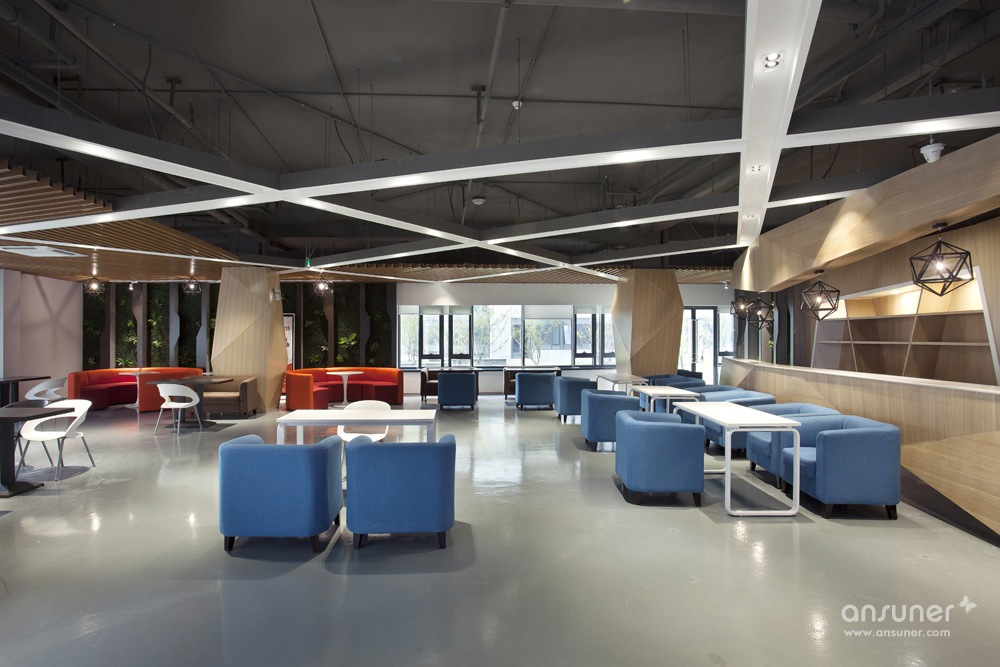 在一楼的沿窗休闲讨论区里,整面墙采用绿植装饰,与室外的绿化相呼应。咖啡厅的效果以简洁为主,地面采用了耐磨及耐清洁的灰色调地坪漆,家具及材料的选择也以暗色调为主,以迎合咖啡的色调。办公区内的茶水区是员工讨论休闲的区域,整个色调的运用营造出温馨放松的空间氛围。