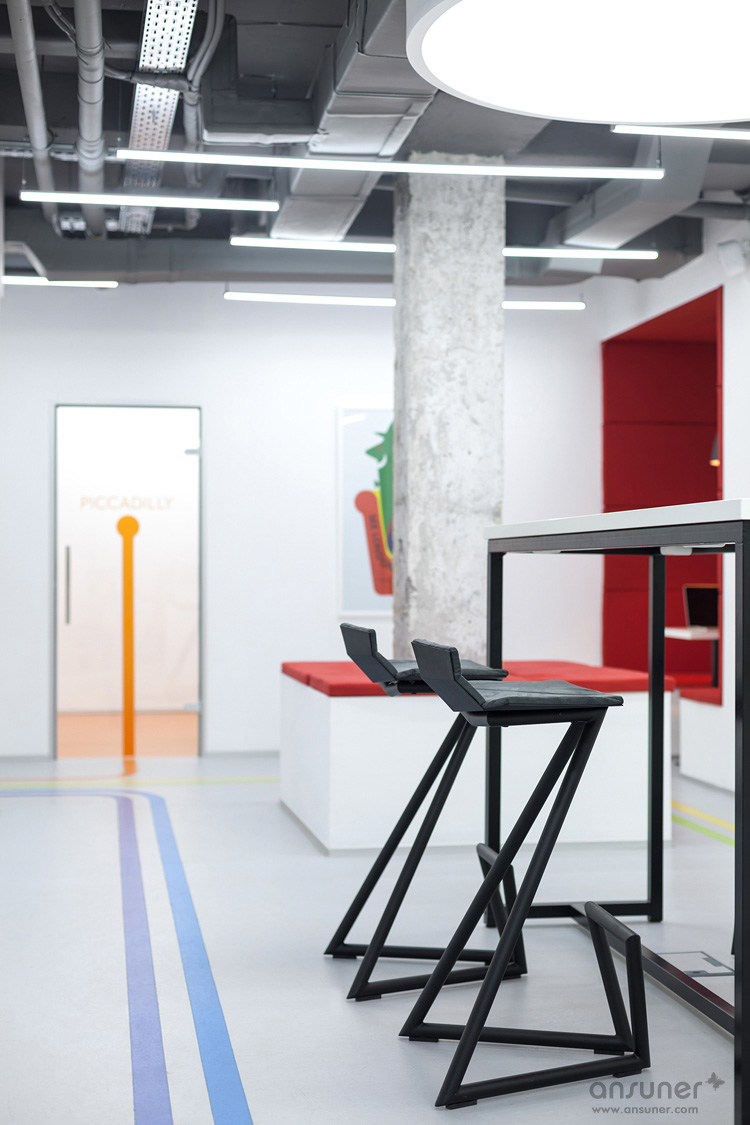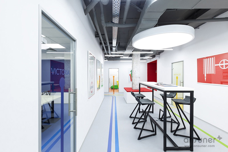 如彩虹般缤纷绚丽的地面彩色线条设计,受到伦敦地铁的灵感启发,不仅具有空间的导向作用,还成为本案的设计亮点。地面上的每一道彩虹线条都标有地铁站的名称,将人们从接待区导引至演讲大厅、主题海报、古色古香的“出口”指示牌、以及如同地铁车厢的红色盒子和其它一些细节设计,令人们时刻感受身处伦敦地铁的氛围。