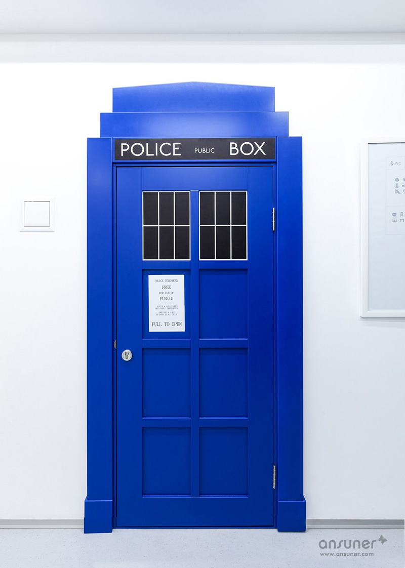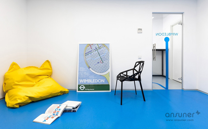 为了呼应整体的英式氛围,室内出现许多“英式元素”,如标志性的电话亭和白色瓷砖饰面等。每间教室的名称也援引伦敦地铁站站名,同地面导引的彩虹线条和名称一致。比如红色线条指引的“Westminster”(威斯敏斯特),线条的终端则是以红色地面装饰的“Westminster”教室;以及蓝色线条指引的 “Victoria”(维多利亚);橙色线条指引的伦敦“Piccadilly”(皮卡迪利)大街等。童鞋们只要跟随彩虹线条的指引就能到达他们的目的地,再也不用担心会迷失了。
