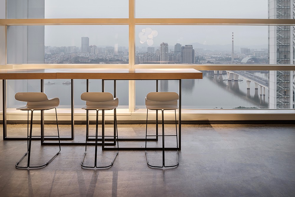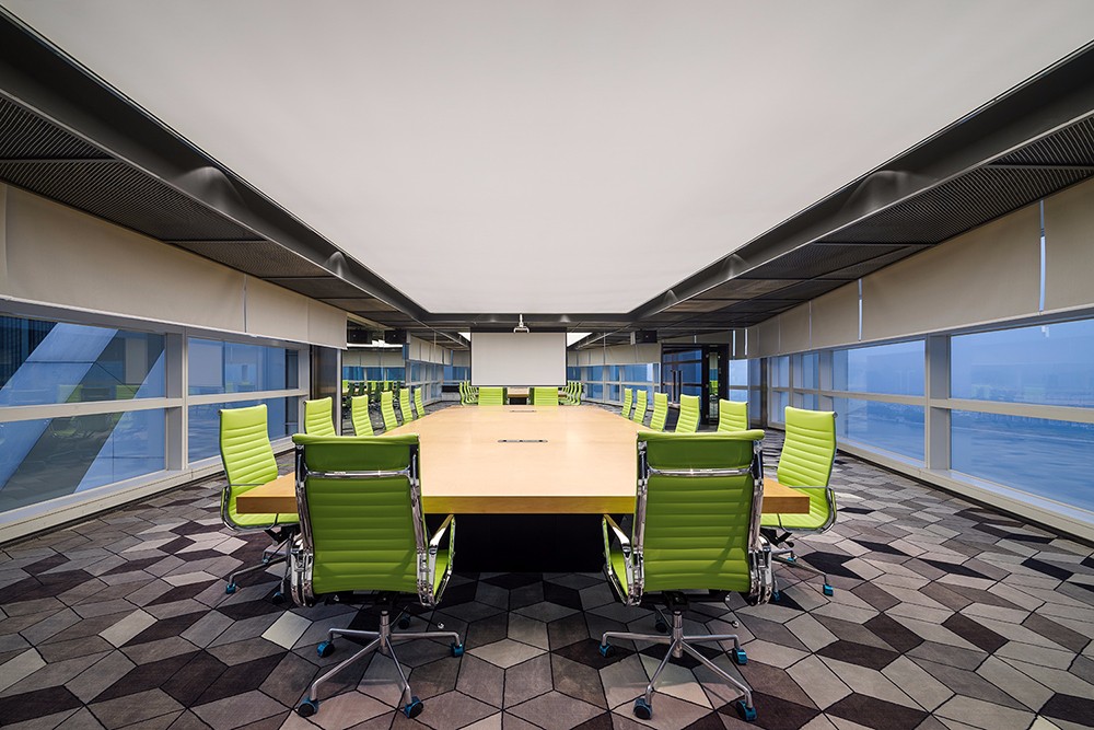 会议室空间宽阔,两边江景映入眼帘,空间色调以灰色和白色为主,再融入绿色的清新和木色的自然。创新的工作及休闲模式,黑色的包容,表达了保利集团的沉稳;跳跃的色系搭配,爆发的是创新的想法。在仿若浩瀚星空的设计中,保利(横琴)创新产业投资管理有限公司办公室展现出了积聚的力量,带给使用者无限的想象和发挥空间,创造更多潜在的商机。
